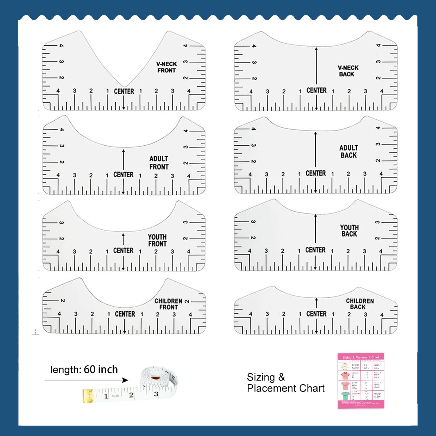 What You Get: 8 t-shirt rulers, 1 measuring tape & 1 product instruction. 8 different sizes of craft ruler guide including v-neck youth child can meet different needs, bring you much handmade convenience
