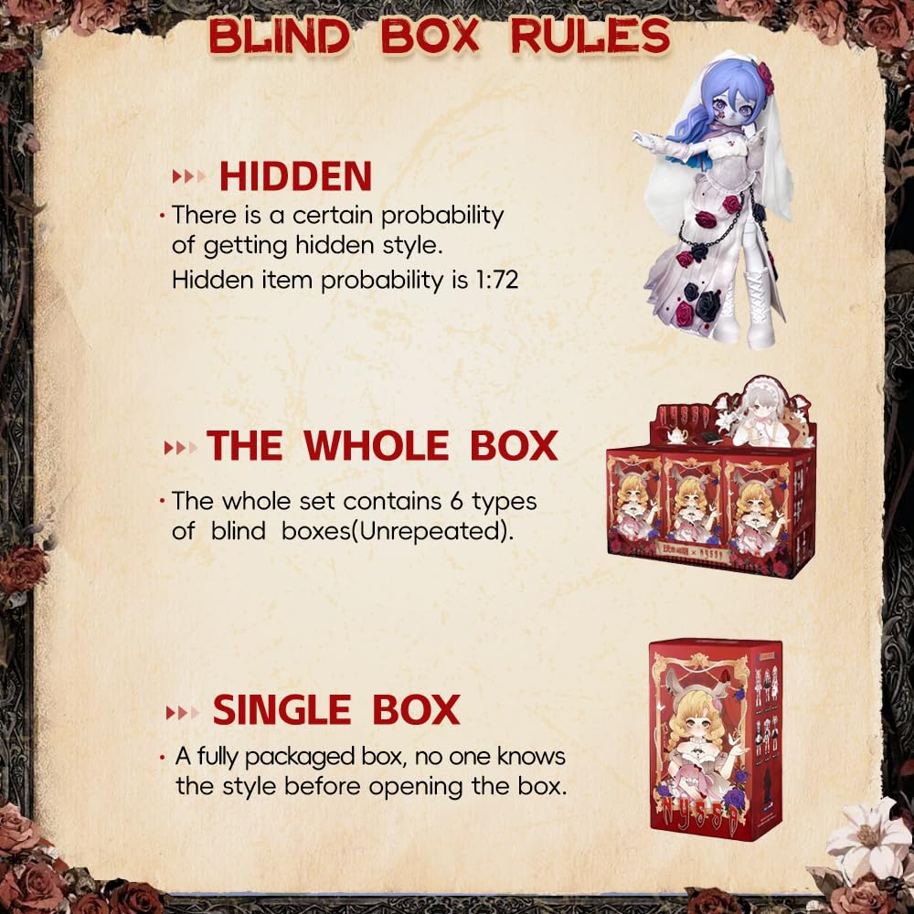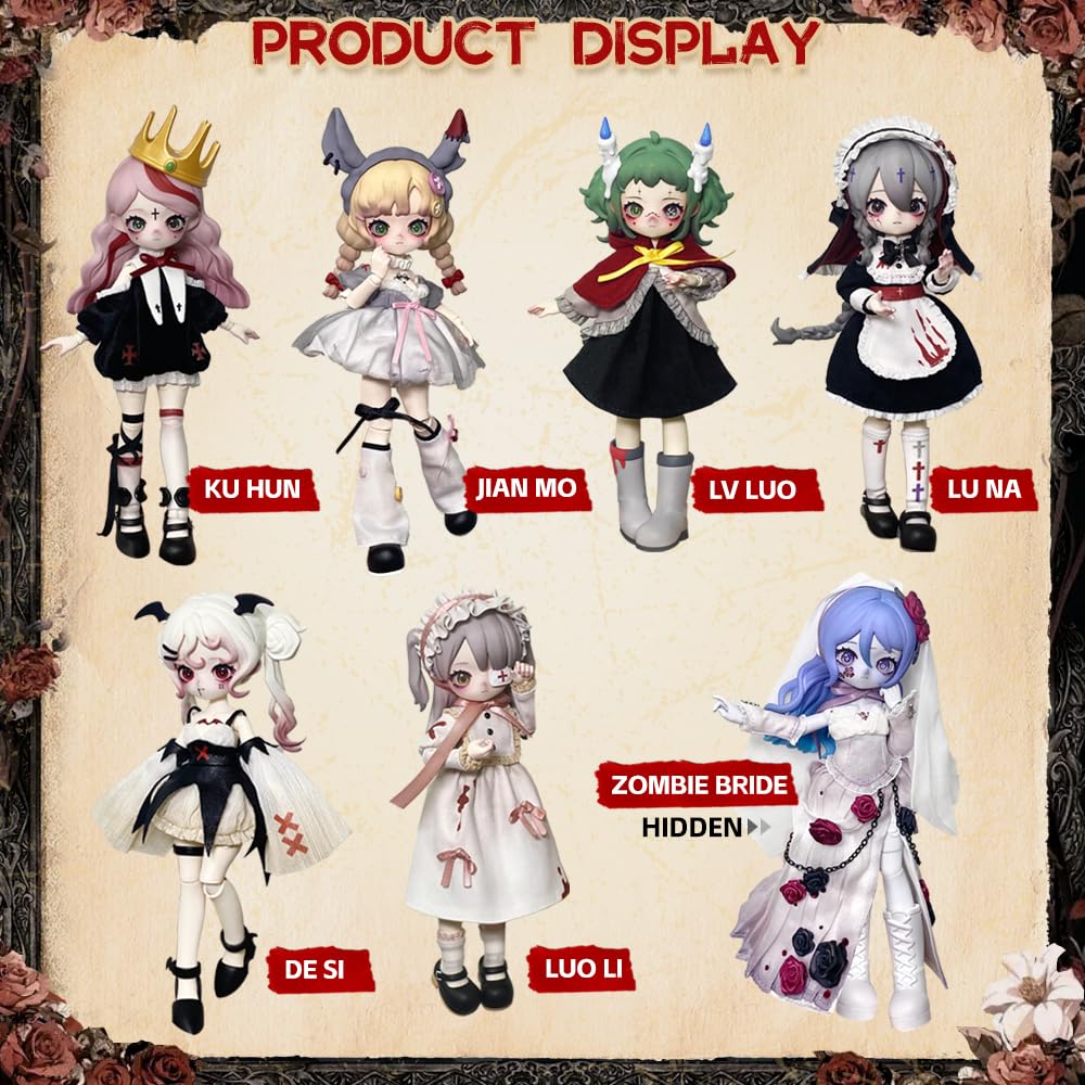 Blind box toys are collectibles that come in a sealed box, with the content unknown to buyers until they open it. This series has 6 regular figures, 1 hidden edition (Zombie Bride) . Each blind box is randomly arranged. You may get the hidden edition in any single box in probability (1/72 for Zombie Bride).