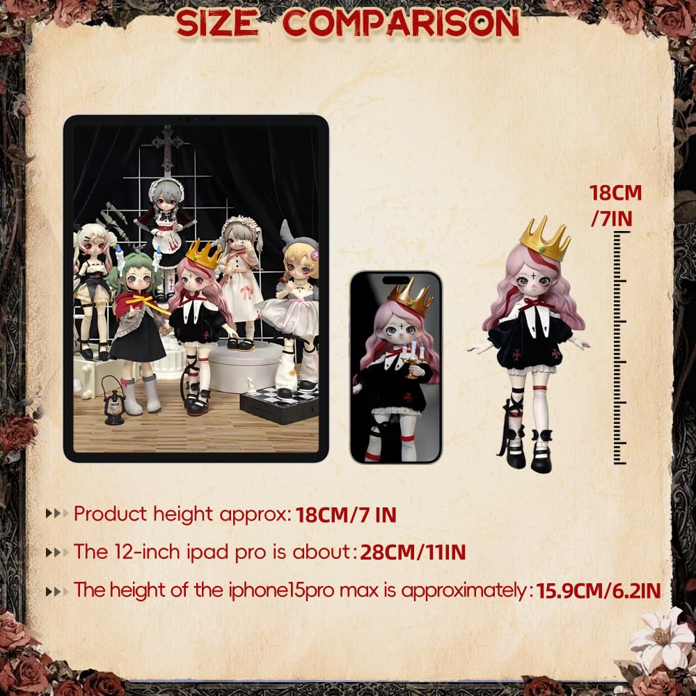 Blind box toys are collectibles that come in a sealed box, with the content unknown to buyers until they open it. This series has 6 regular figures, 1 hidden edition (Zombie Bride) . Each blind box is randomly arranged. You may get the hidden edition in any single box in probability (1/72 for Zombie Bride). The whole set contains 6 blind boxes.Not repetition.If you buy a whole set and get a repeated dolls,please contact us. We will handle it for you. Material: ABS/PVC/Fabric (Safe and high-quality material) Applicable age: 15 years old and above The height of the action figure: about 18CM (different for each model) Please refer to the pictures on the page for detailed sizes. Since the size is measured manually, there may be some errors. Please note that the color of the product may differ slightly from the photo due to the influence of the personal computer, environment, light, etc. If you have any questions after receiving the package, you can contact us at any time. Thank you very much.