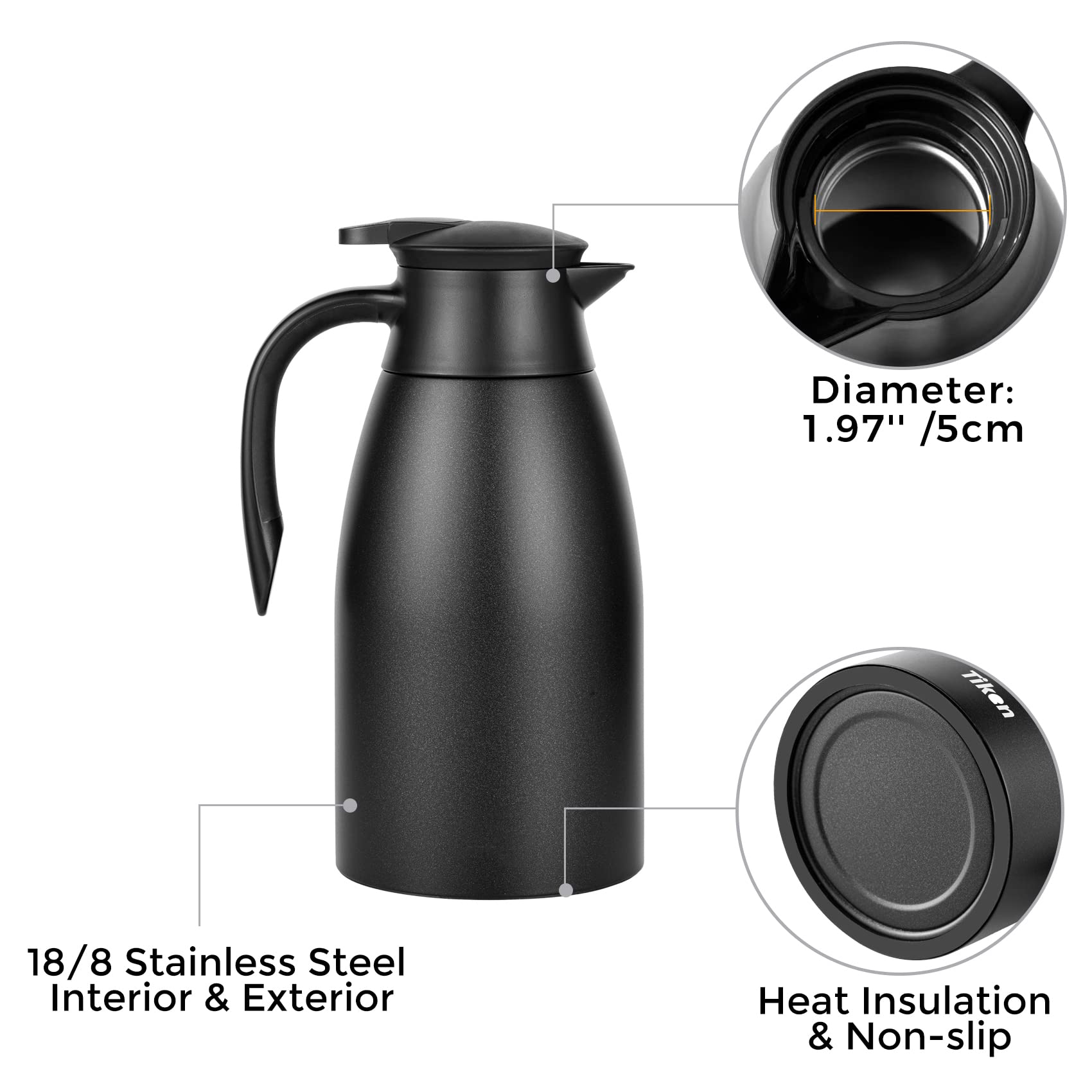 This coffee carafe has a capacity of 68 Oz(2.0L). Tiken vacuum insulation technology locks in temperature to preserve flavour and freshness, that keeps the temperature above 168.8°F at 12 hrs (assuming a starting temperature of 203°F, a room temperature of 68 °F and water left untouched throughout the duration of the test). Pls note test results will vary depending on beverage starting temperature and how full the carafe is.