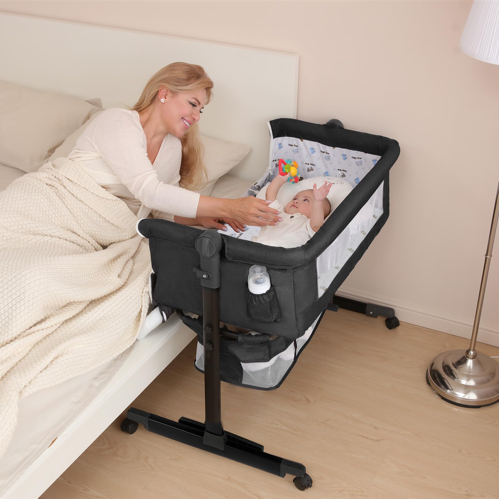 Multi-functional design: The crib-side bassinet doubles as a bedside sleeping basket, and can also be used independently as a bassinet or an inclined nursing bed. It can be manually adjusted to adult bed height at any time and connected to an adult bed.