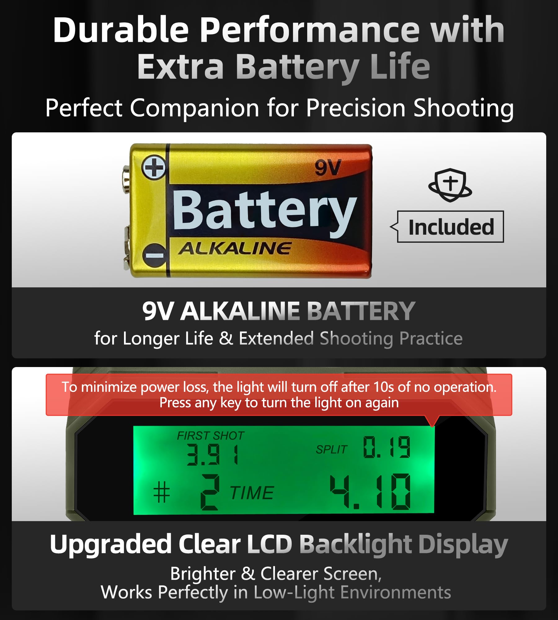 Enhanced Screen and Battery Life: The high-definition screen and longer-lasting battery ensure your timer remains functional and easy to read throughout your gun shooting session