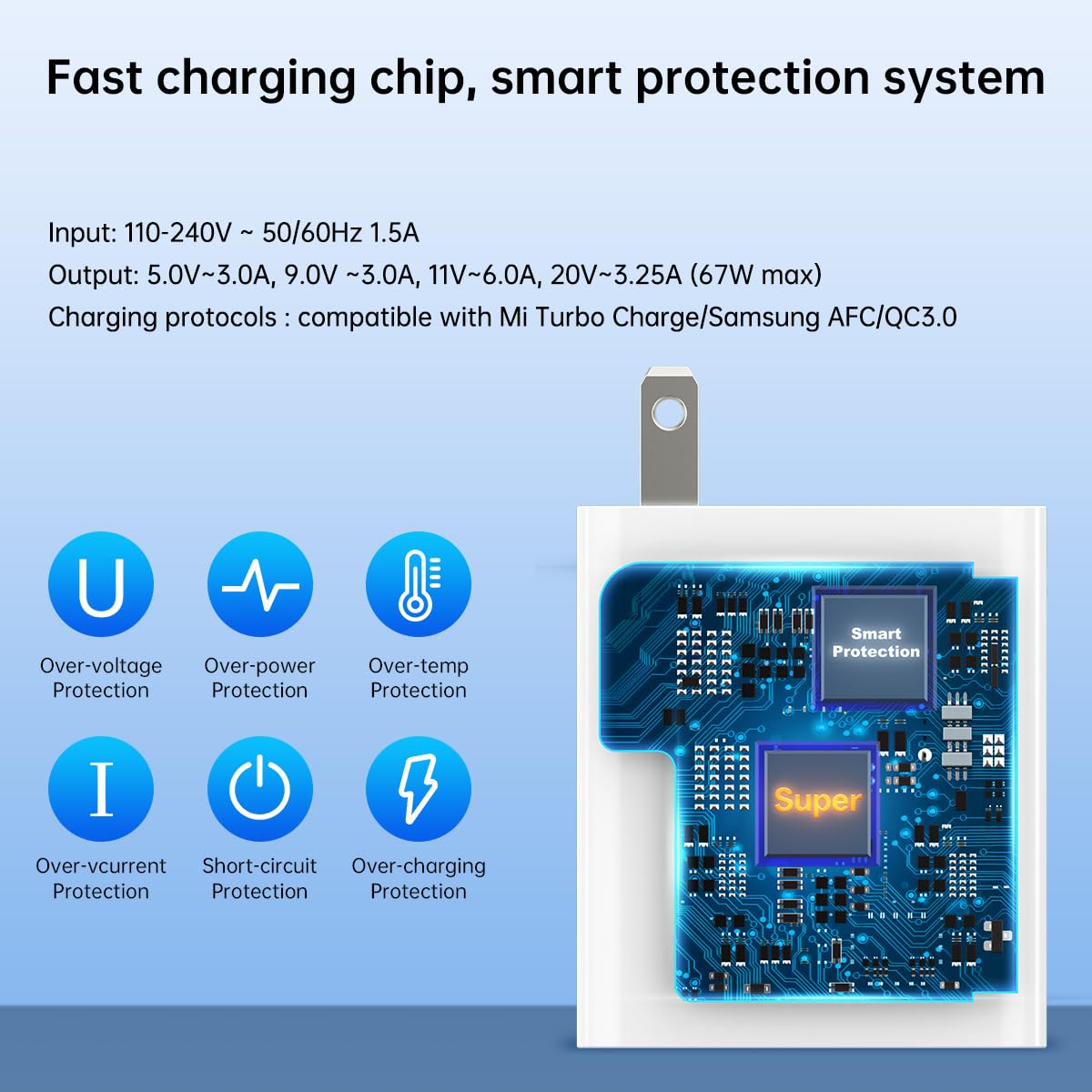 Package Included - 1x 67W Fast Wall Charger, 1x 3.3ft 6A USB-A to C Cable