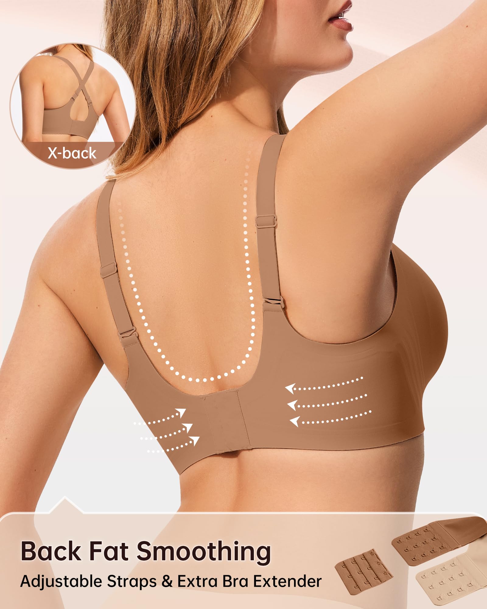【Back Smoothing Comfortable Bras for Women】LetsJoli bras for women full coverage feature an invisible back closure design, with wider side wings that smooth underarm and back lines, ensuring a beautifully contoured silhouette. Featuring a back hook design with 4 rows and 3 hooks, and an additional extended hook included. The ample adjustable length allows the bra to seamlessly accommodate fluctuations in breast size and waist circumference