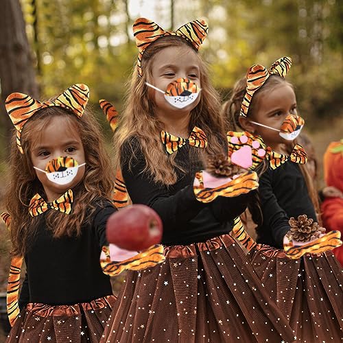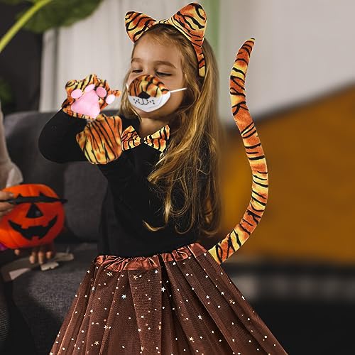 Halloween Tiger Set: You will receive a tiger thick ear headband, a clip on bow tie, a nose cover, a pair of gloves, a clip on tail, and a star brown dress. The newly designed tail can not only be clipped onto clothes, but also designed according to needs. A lively and cute set of clothing accessories to meet your cosplay needs