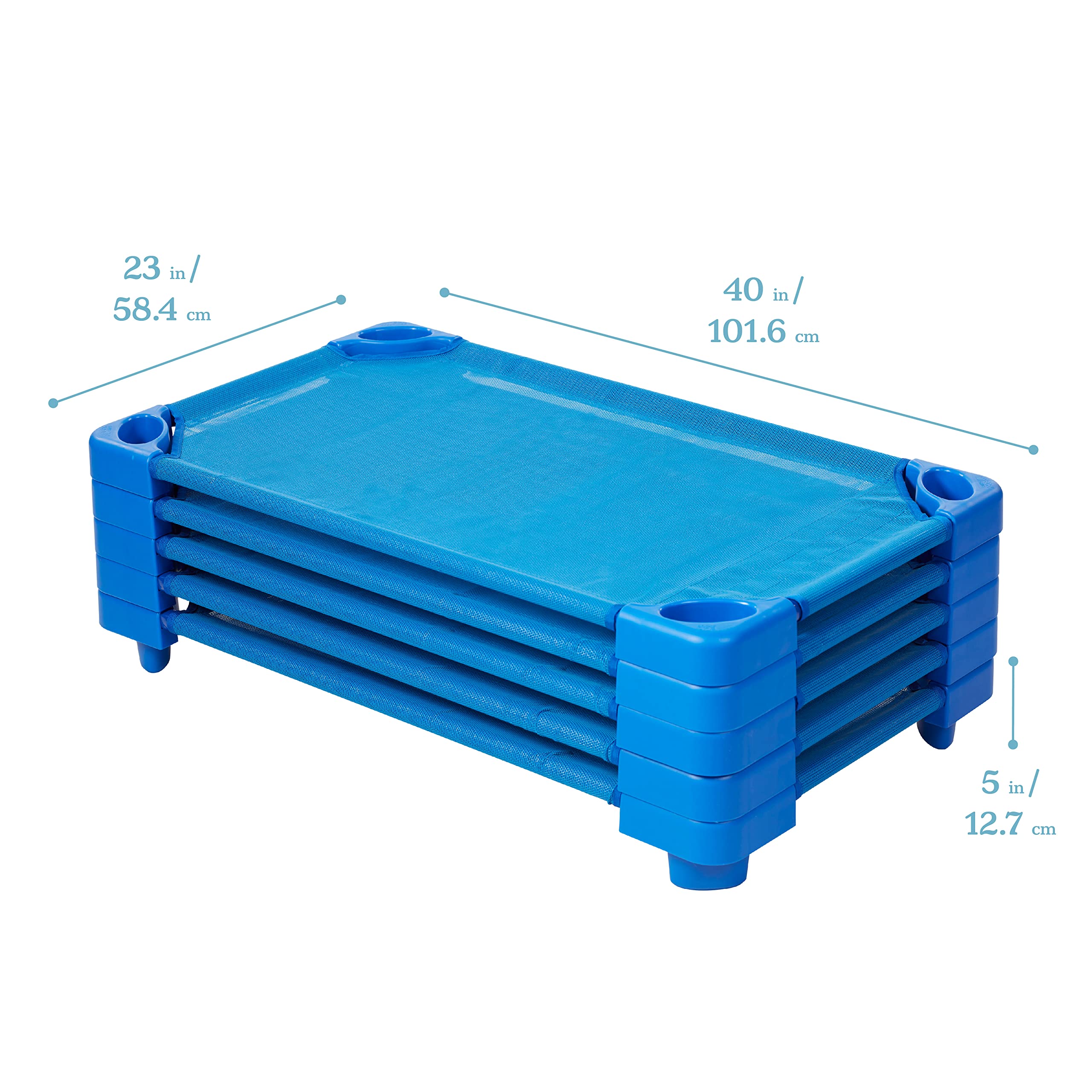 Naptime is a daily ritual in early childhood facilities including daycares and preschools. Stackable Kiddie Cots, in a toddler size of 40”, provide comfort for children and convenience for teachers. Kids will sleep comfortably on their individual cot; designed for everyday use in classrooms, home daycares and schools. Daily sleep routines help developing brains work to their full potential and foster a happy learning environment. Toddlers are elevated off the ground for a supported surface with air circulation below, keeping kids comfortable and cool. Lightweight cots stack up to 20 high for compact classroom storage, saving valuable classroom floor space. Sturdy cots are constructed with powder-coated steel poles, durable plastic corners, and a breathable stretch-resistant mesh that’s tightly fitted to the frame with minimal gaps to protect little fingers and toes. Children can stretch and get comfy during their nap, while feeling stable on the taut mesh. Adult assembly is required, use hook and loop to secure the mesh to the poles. Pair with ECR4Kids rest time accessories including cot sheets and blankets, sold separately.
