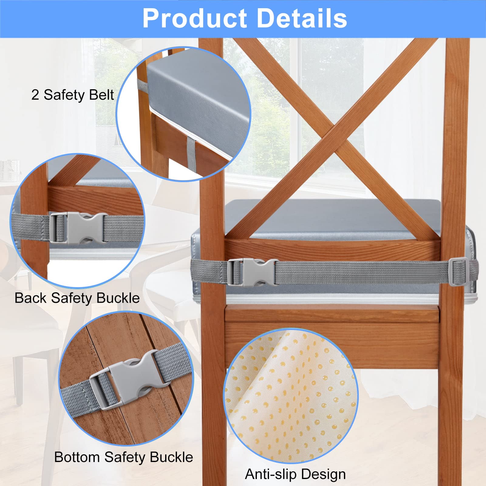【Safety & Installation】The portable booster seat is designed with two seat belts, which can firmly fix the booster seat cushion to the chair from the bottom and back,the bottom is made of non-slip silicone,so that the booster cushion is not easy to slide,ensure the safety of children when eating on the table.The extend length of two adjustable seat belts is 18 inch-28 inch,so it is suitable for most dining chairs.