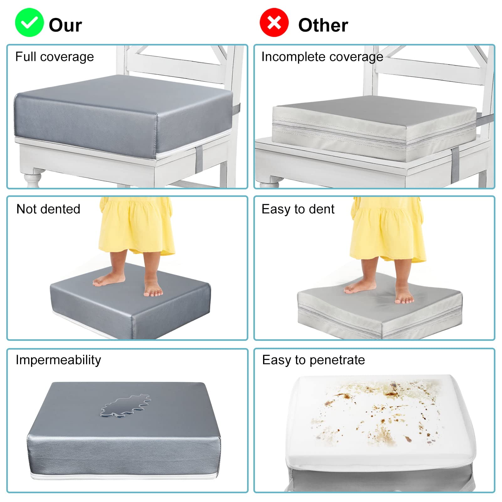 【Exlusive Material】KOXUIUF toddler booster seat for dining table made of high quality PU synthetic leather and soft high-density memory foam, so kids booster cushion is very sturdy and not squashy.It can hold enough weight to make your baby without sinking down,so that they can enjoy the meal comfortably. If drops food on booster seat accidentally, jsut wipe it with a rag.
