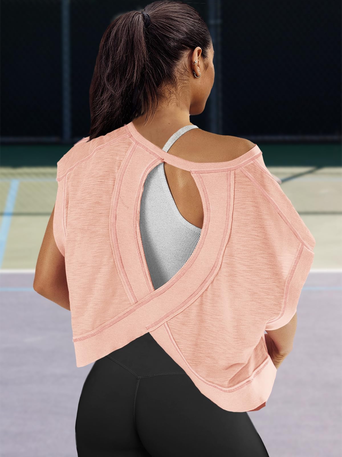 Fit: Please order your regular US size. The workout tshirts for women is an oversized style that not only flatters your figure but also pairs effortlessly with any outfit. If you want a more comfy loose fit for this womens open back tops, suggest ordering one size larger.