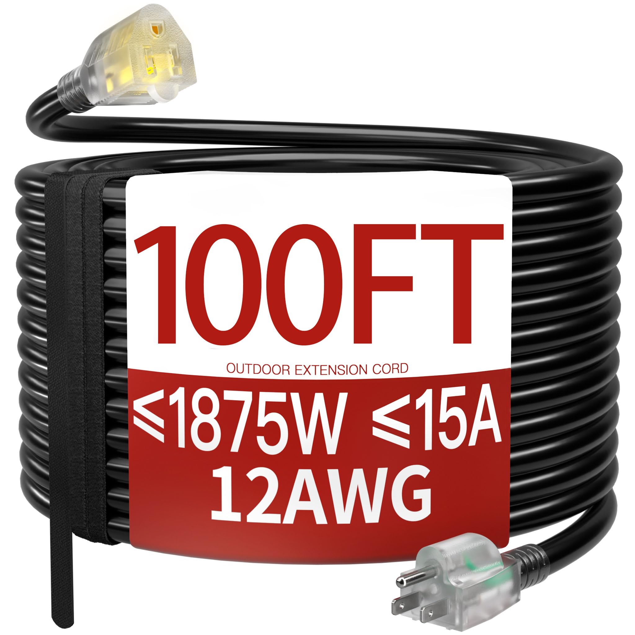 ETL Listed and Trusted: Heavy duty extension cord 100 ft rated 15 Amps, 1875 Watts and 125 VAC; Male NEMA 5-15P and female NEMA 5-15R; It is ETL/cETL Listed; ensuring its compliance with strict safety standards; each outdoor extension cord passes a 2500V high voltage test before leaving the factory to ensure safety; Reliability and efficiency outdoor extension cord waterproof are capable of meeting most electrical needs