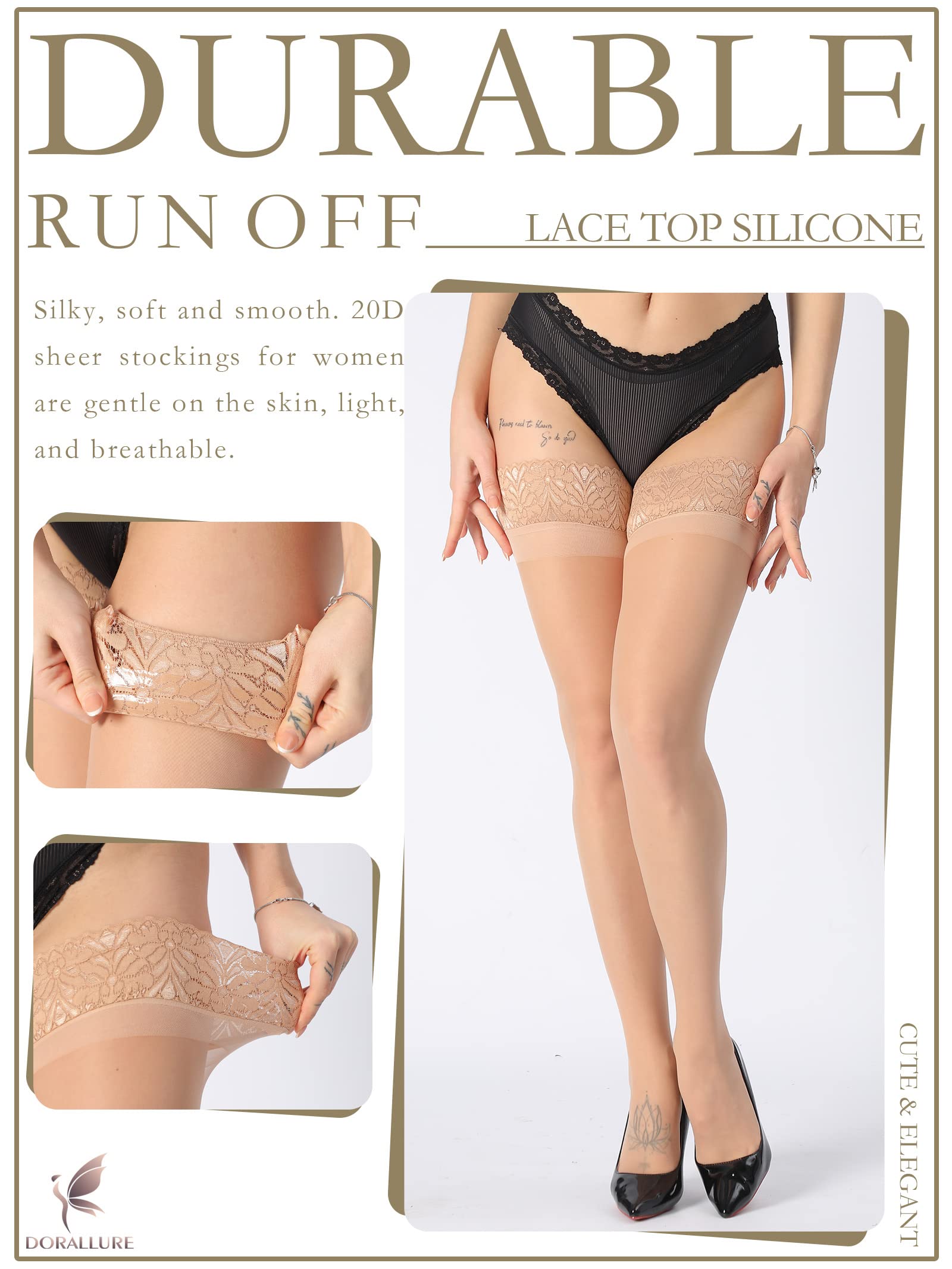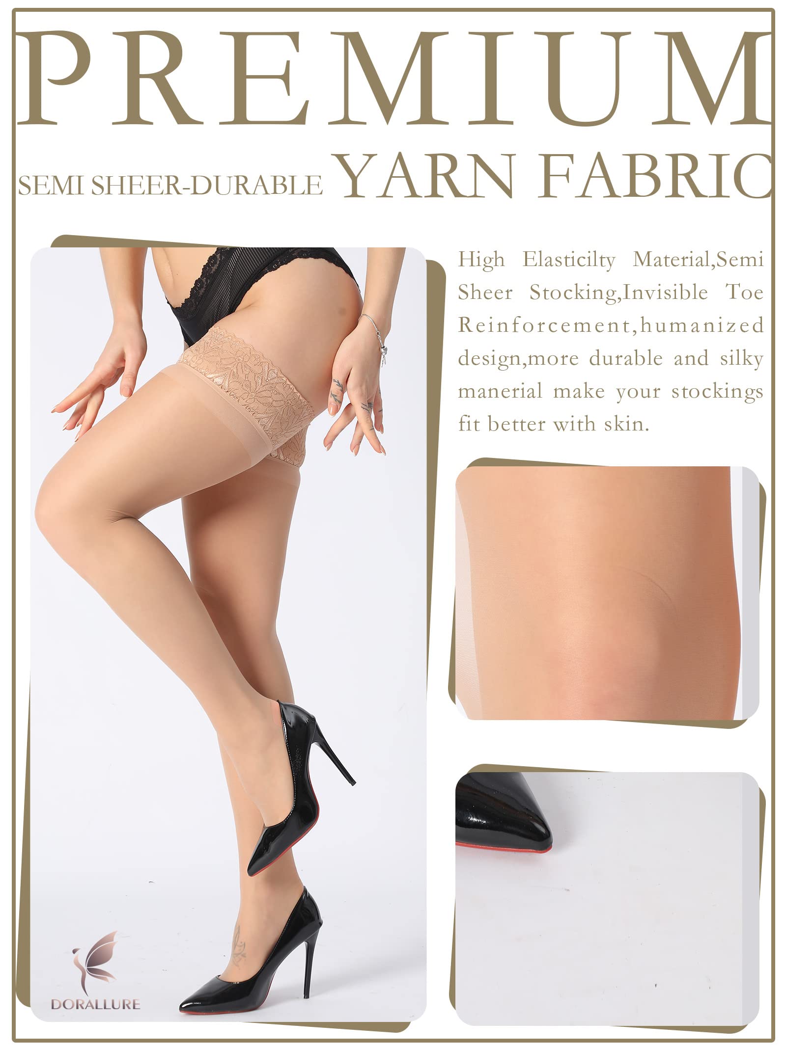 [PREMIUM YARN FABRIC] DORALLURE thigh high stockings for women silky, soft and durable.After continuous search and improvement, we finally chose this fabric. The silky texture makes them feel incredibly natural and soft. These stockings are ideal for work, holidays, evening wear, & for wedding or bridal uses.