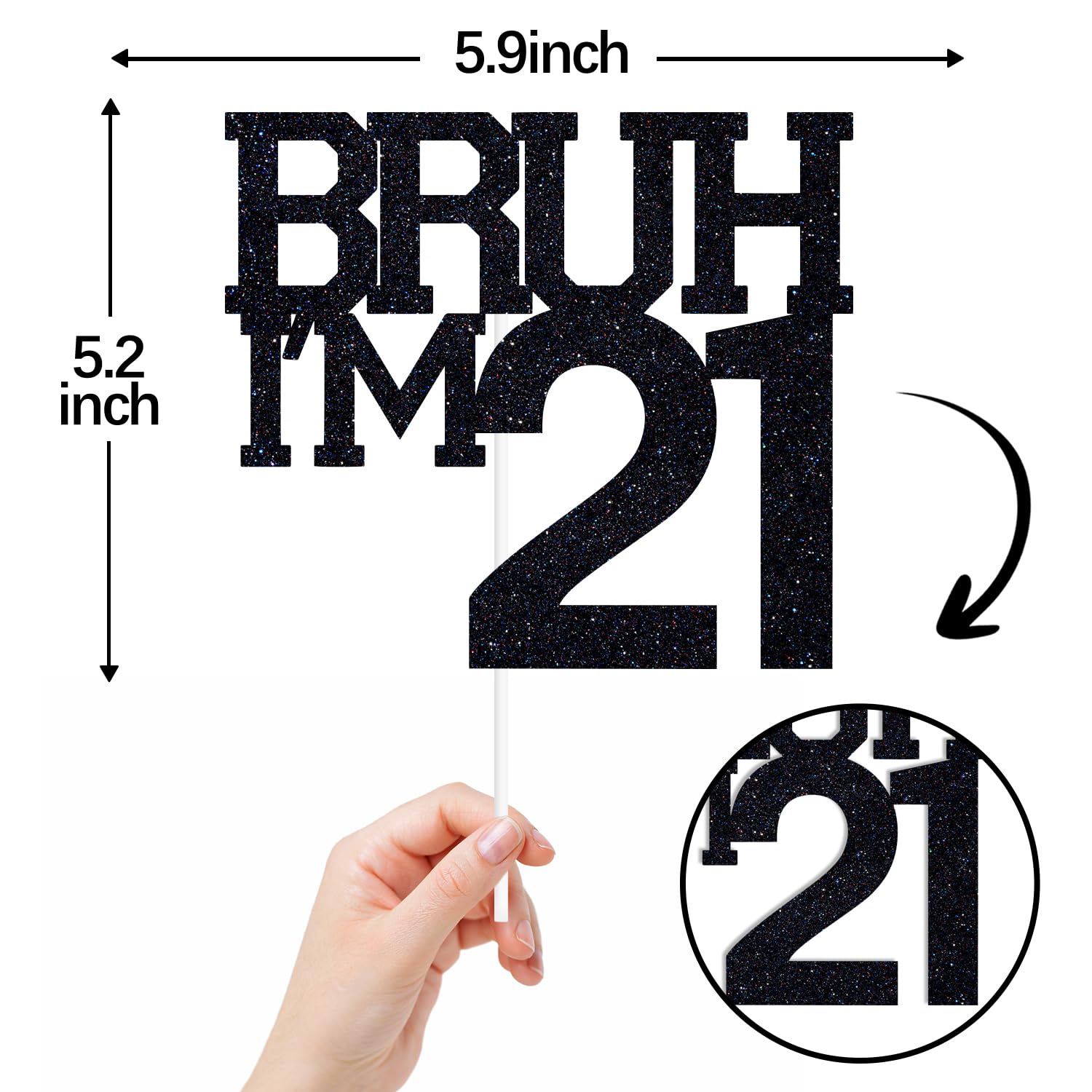[21st Birthday Party Cake Topper]: Showcases trendy "Bruh I'm 21" text that adds a humorous and contemporary element to the celebration. [High Quality Materials]: Made from 100% paper, this birthday cake topper is sparkly, durable, safe and easy to recycle. [Pretty and Practical]: Bring a surprise to your birthday party! [Distinctive Design]: This cake topper can make a big splash at your birthday party! [Community Service]: Please notify us by email if there is any problem with the cake decorations or if the product is not to your satisfaction.