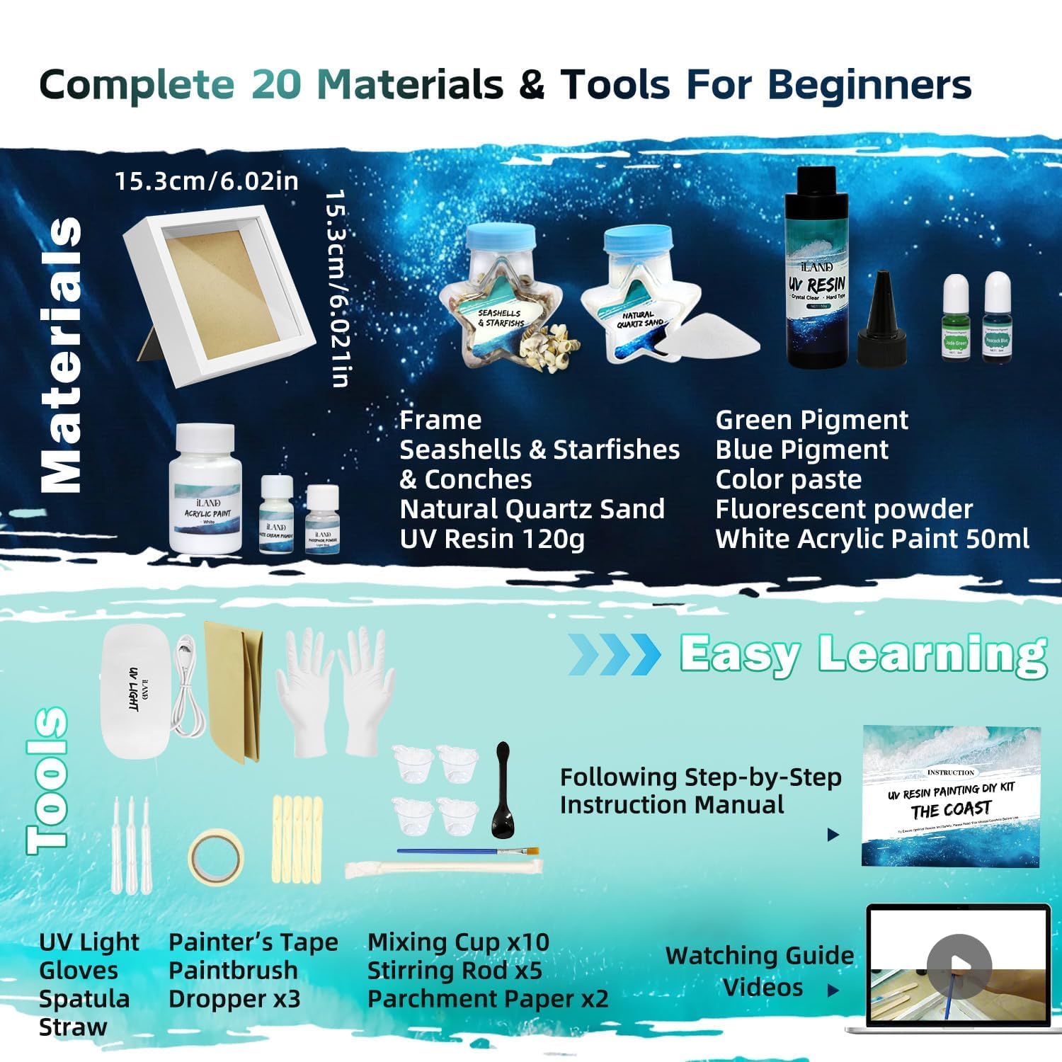 🛠️ All-Inclusive Craft Kits: With frame, UV resin kit with light, pigments, tools, sand, and seashells, follow our step-by-step guide to craft resin art like a pro— nice for beginners!
