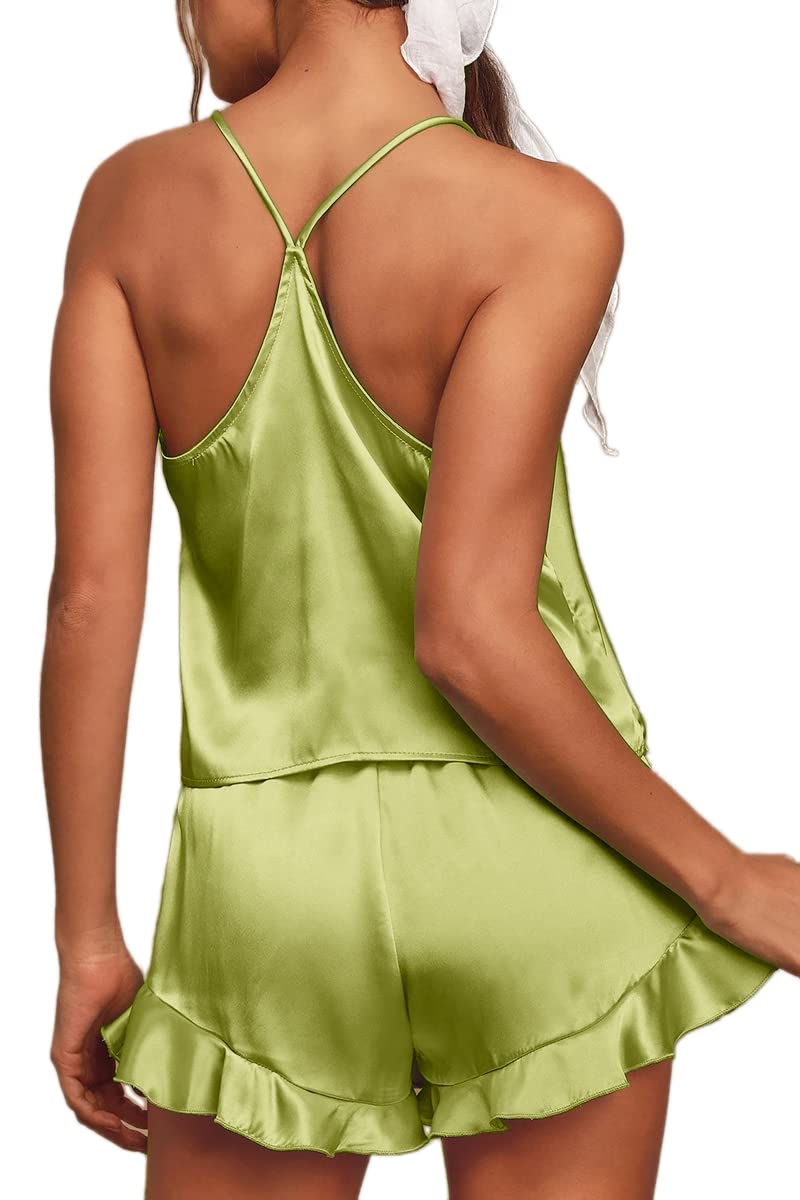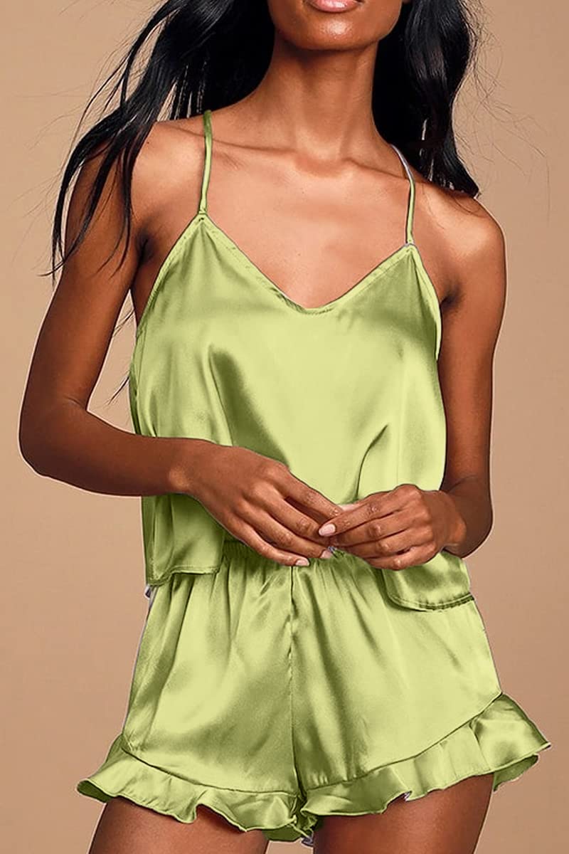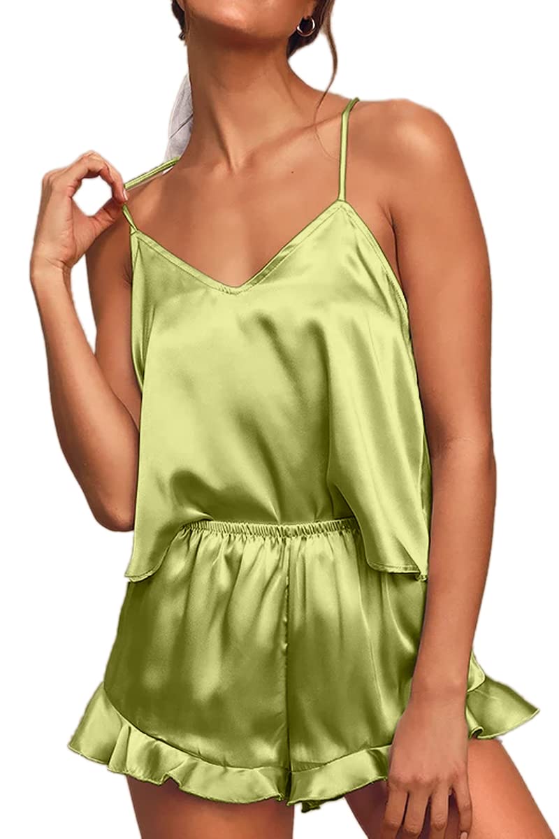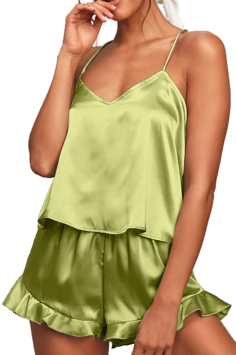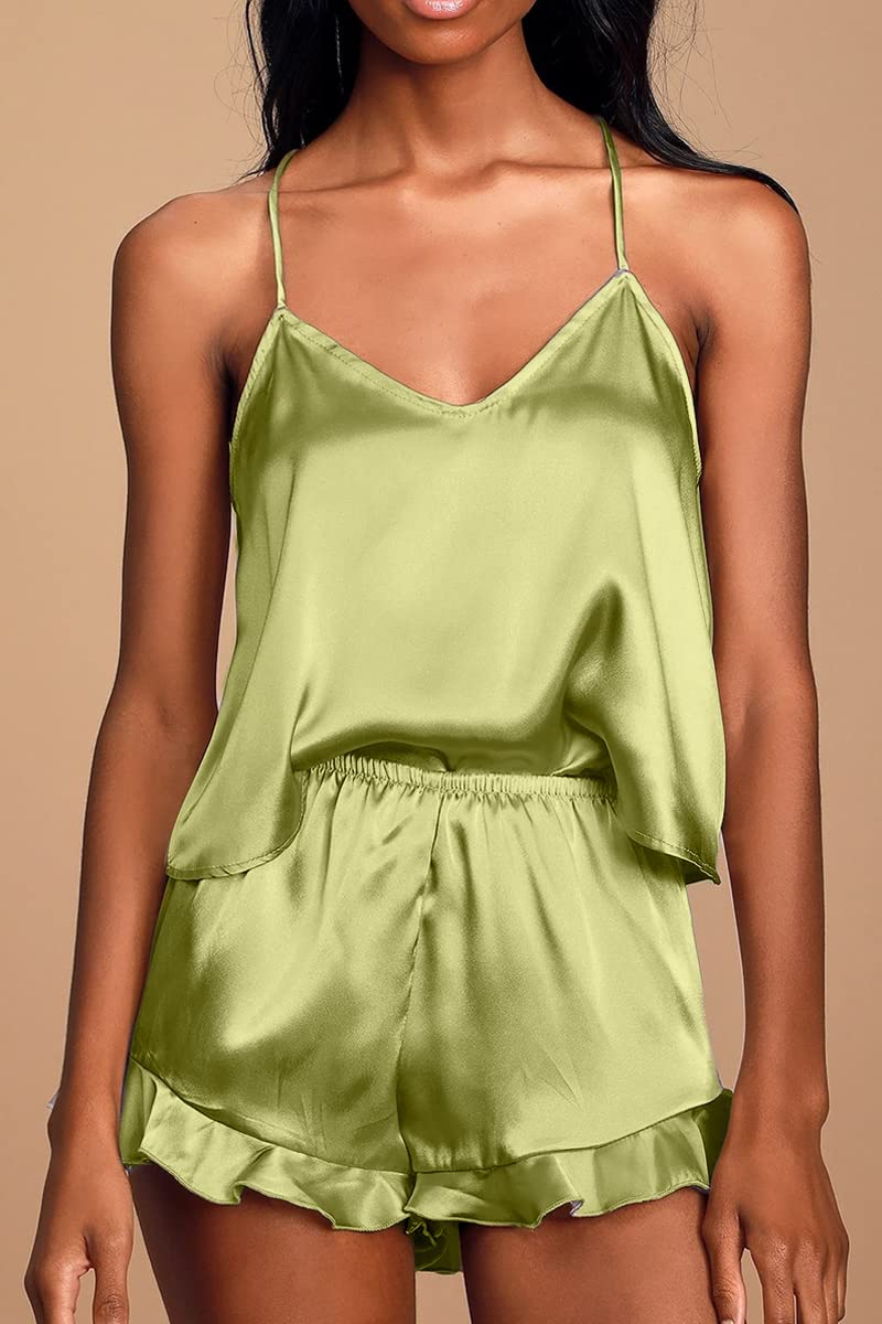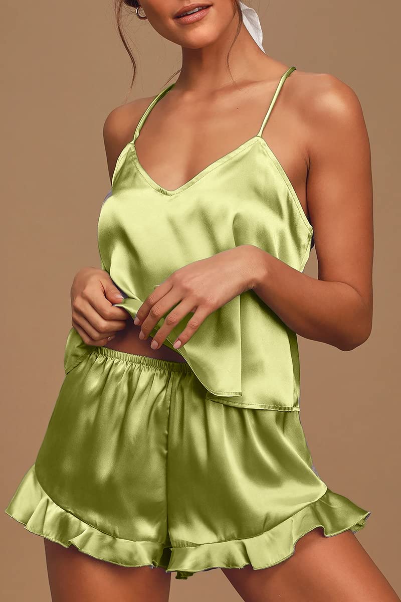 The cute satin silk cami pajamas tops features v neck,low cut,racerback,adjustable straps,the shorts features high waisted,elastic waist,casual loose style.The cute and sexy pajamas sets will make you look more flattering,elegant for your sweet night.