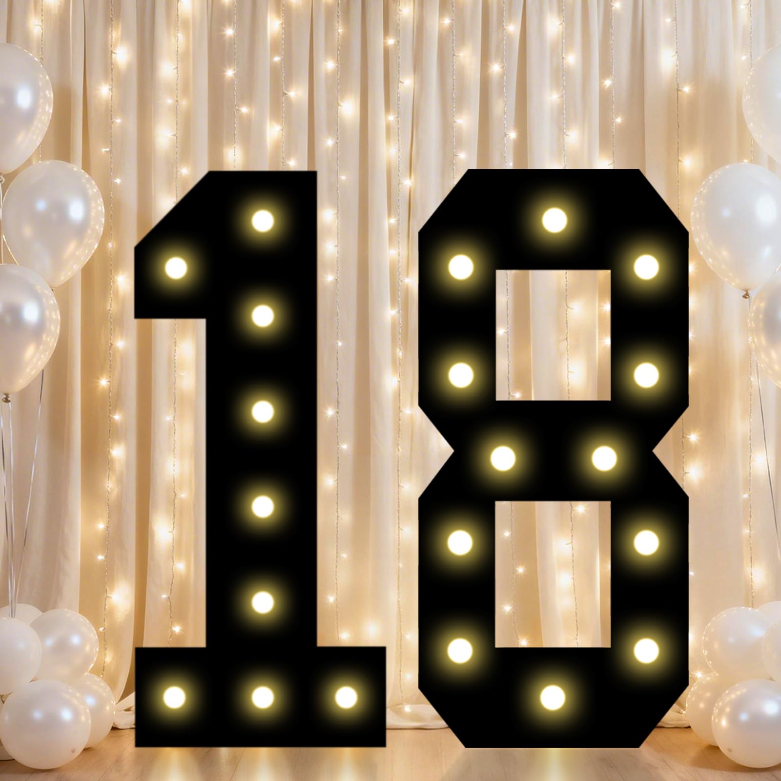 Giant Black 2.4 Feet Marquee Numbers with LED Lights: Mosaic numbers designed with warm white LED string lights. Giant LED numbers can be powered by 3 AA batteries (Not Included), convenient for all kinds of party decoration