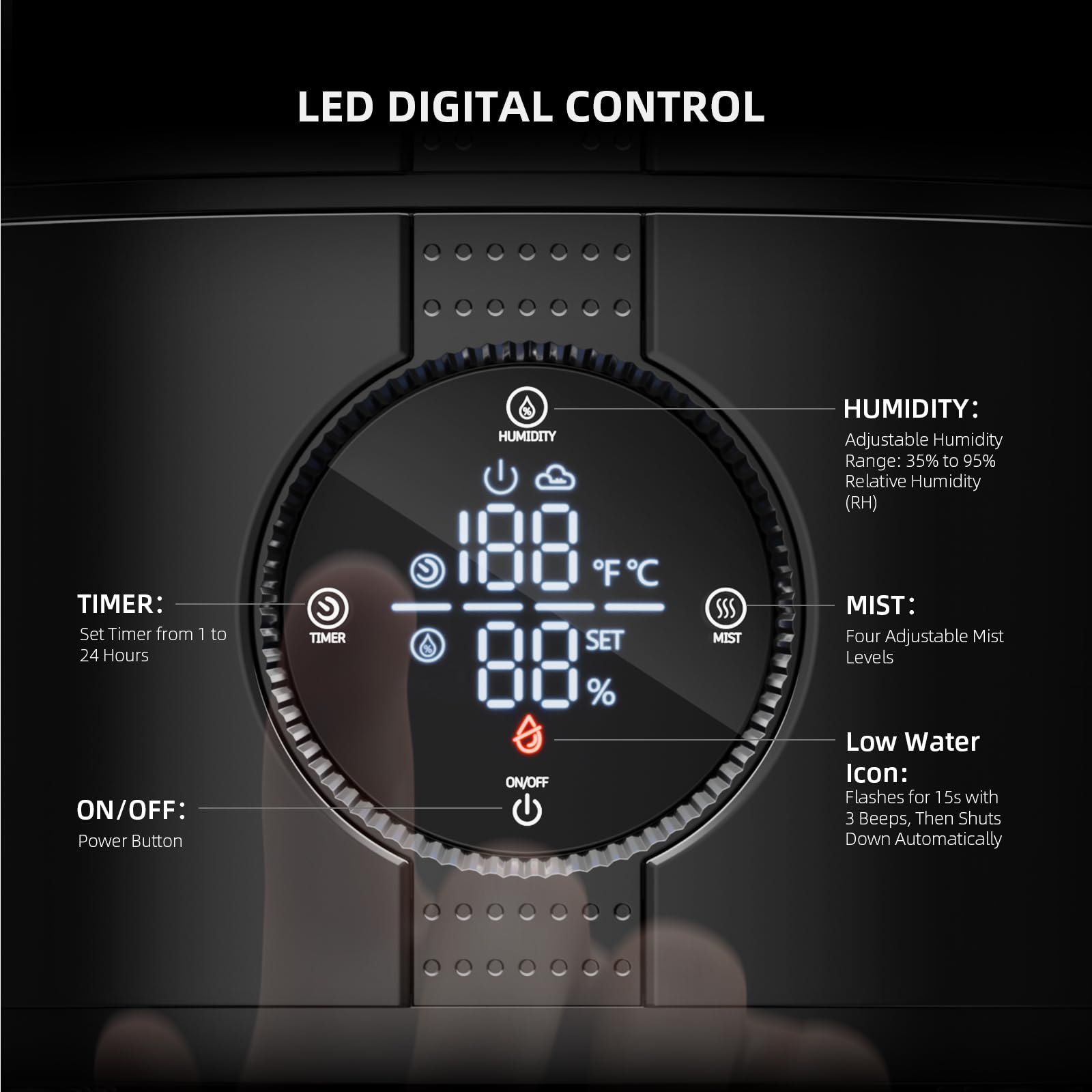 【Relible Humidity Control】4 adjustable mist levels and humidity settings from 35%–95% (in 5% increments). The upgraded temperature & humidity sensor ensures accurate readings and automatically turns the humidifier on or off to maintain your desired level, quietly run ≤35dB.