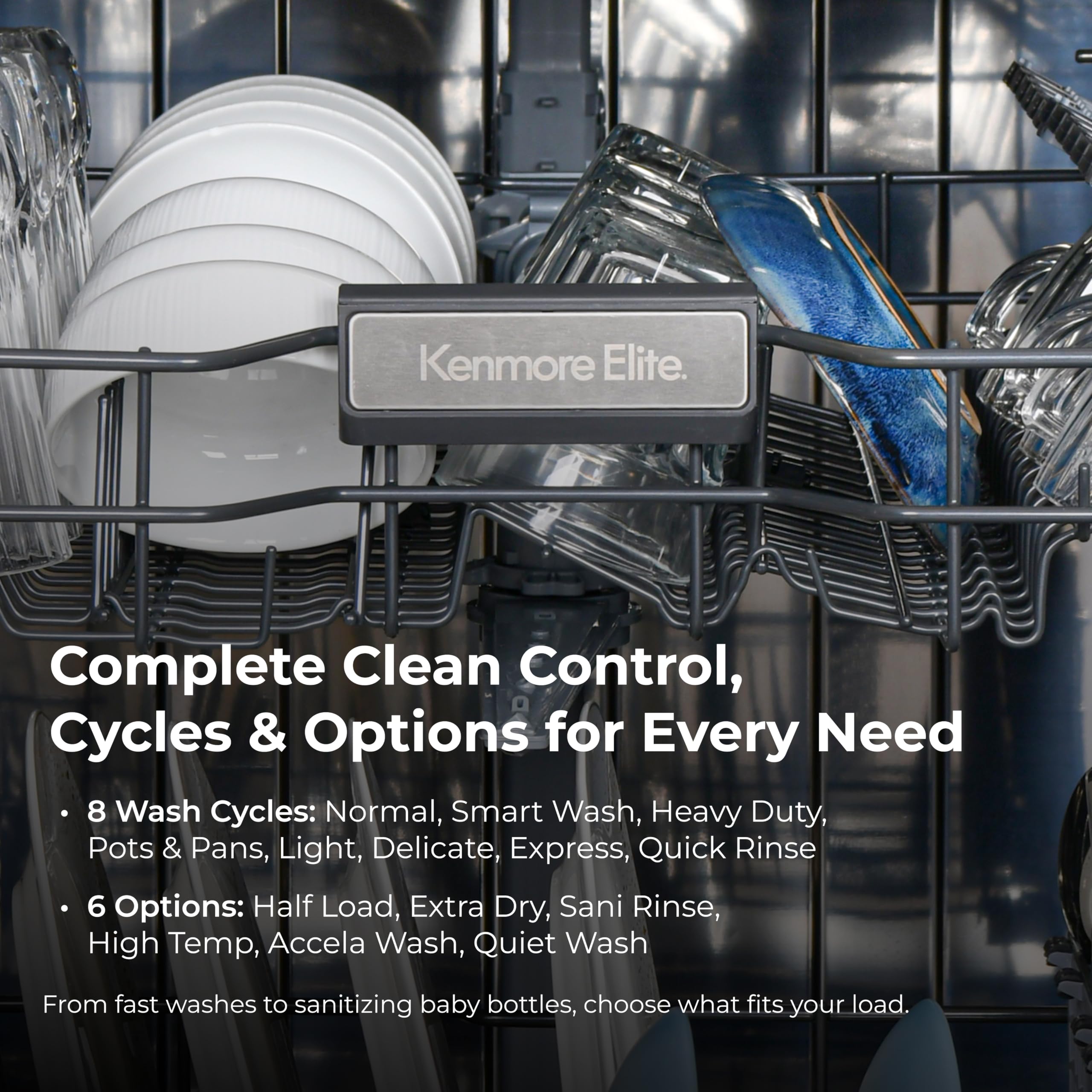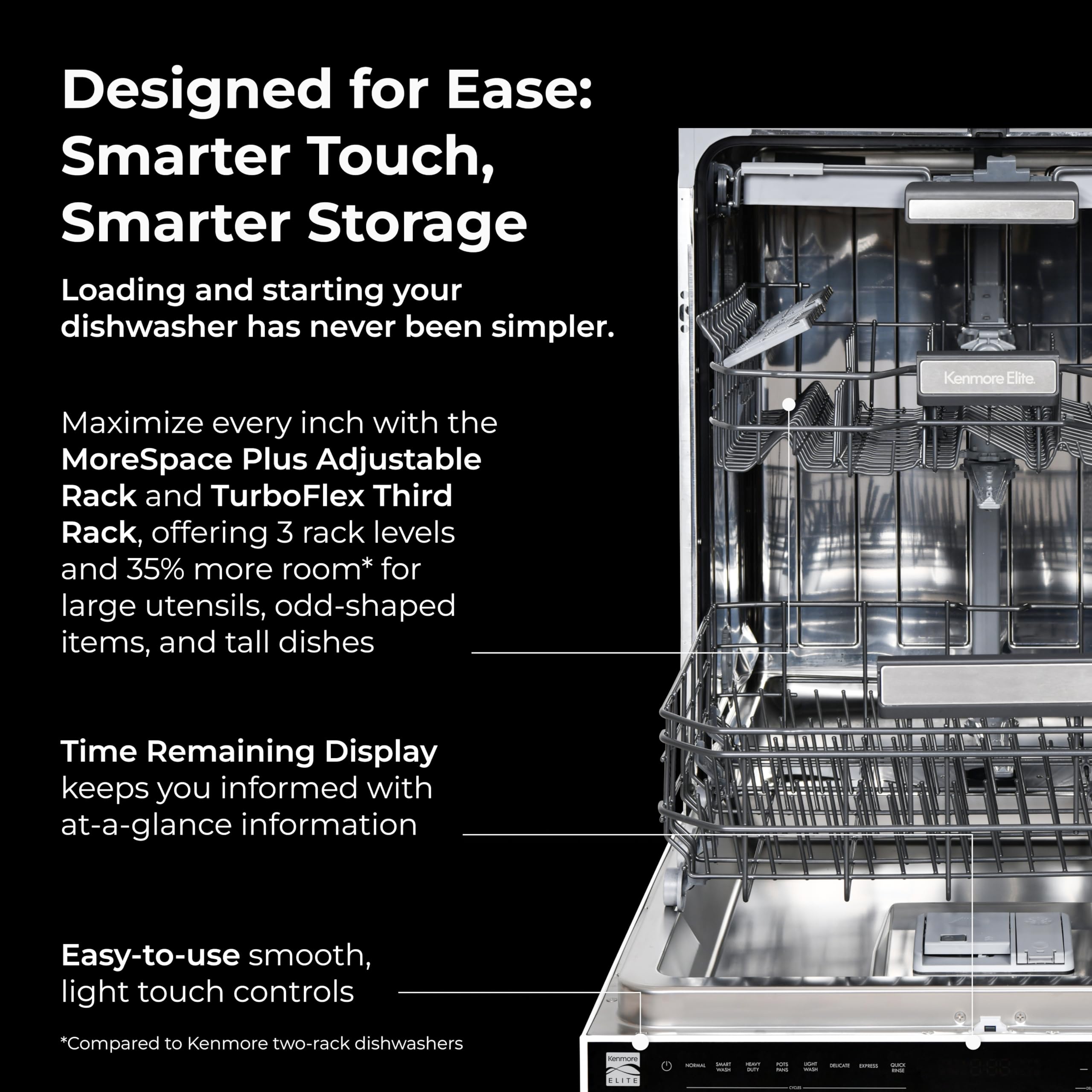 The Kenmore 24" Built-In White Dishwasher delivers ultra-quiet performance and modern design for busy nights and delicate dishes. UltraWash Plus uses three spray arms and filtered water to power through stuck-on food. The SmartWash Cycle detects soil levels in the water and automatically adjusts the temperature, pressure, and cycle time for a deep, efficient clean every time. TurboDry uses hot air circulation and a heating element to remove moisture from every load, while the Extra Dry and Express Cycles give you cabinet-ready results faster. The TurboFlex Third Rack adds 35 percent more loading space for long utensils, tools, and flatware, and slides aside to make room for tall items below. The MoreSpace Plus Adjustable Rack shifts between three heights, even when fully loaded, so you can customize the interior for everything from oversized pots to delicate stemware. The stainless steel tub resists stains and retains heat to help improve drying performance with every cycle. Built-in LED interior lighting makes it easy to see inside, and a green floor light shows when the cycle is running. Hidden light-touch controls and a clean white finish complete the look. This dishwasher fits up to 15 place settings and includes a removable wine glass holder for added peace of mind when washing stemware. ENERGY STAR Certified and operating at just 42 dBA, it offers a powerful clean that runs quietly in the background. Built-in Leak Detection helps protect your home by monitoring water flow and automatically draining if a problem is detected.