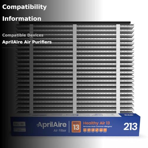 A small change can make a big difference in your home environment. AprilAire delivers that difference with the 213 Healthy Air 13 Filter. The 213 replacement whole-home filter traps and removes the most common allergens including airborne pollen, mold spores, bacteria, pet dander, dust particles, and dust mites as air circulates through the MERV 13 filter. Discover a healthier home environment with the AprilAire 213 Healthy Air 13. Your HVAC system is protected from airborne particles too, which helps lower your energy costs, and can prolong the life of your equipment. Lengthen your HVAC system's life and improve your home's energy-efficiency by reducing dust buildup. Genuine AprilAire filters are specifically engineered to work with your AprilAire air cleaner and come with the Pure Fit Promise ensuring that the filter will fit your AprilAire air purifier equipment exactly. Efficient home and system protection - extremely low initial resistance and high dust holding capacity support up to 12 month filter life, saving you time on furnace filter changes compared to traditional 1-3 month filters. AprilAire 4-inch filters provide superior filter area (28 square feet of filtering media) for harmful particles to be captured compared to common 1-inch filters. The patented Self-Seal Technology assures no air will pass by unfiltered, keeping your home clean and HVAC system operating at peak performance. The AprilAire 213 Healthy Air 13 Filter has a nominal air filter size of 20 x 25 x 4 inches and is compatible with AprilAire Air Cleaner Models 1210, 1620, 2120, 2200, 2210, 2216, 3210, 4200, or Space-Gard 2200 with Upgrade Kit 1213. The AprilAire Patented Interlock Rail System means no assembly required - easy and quick three-step filter replacement process. Illustrated packaging includes detailed air filter replacement instructions. Designed and made in the USA and backed by the AprilAire Clean Coil Commitment. Note: MERV is a scale used to measure the effectiveness of air filters. Higher number values translate to more effective filtration. *Performance tested to ASHRAE 52.2 Standard, minimum efficiency reporting value – MERV 13. Contaminants removed based on air passing through the filtering system.
