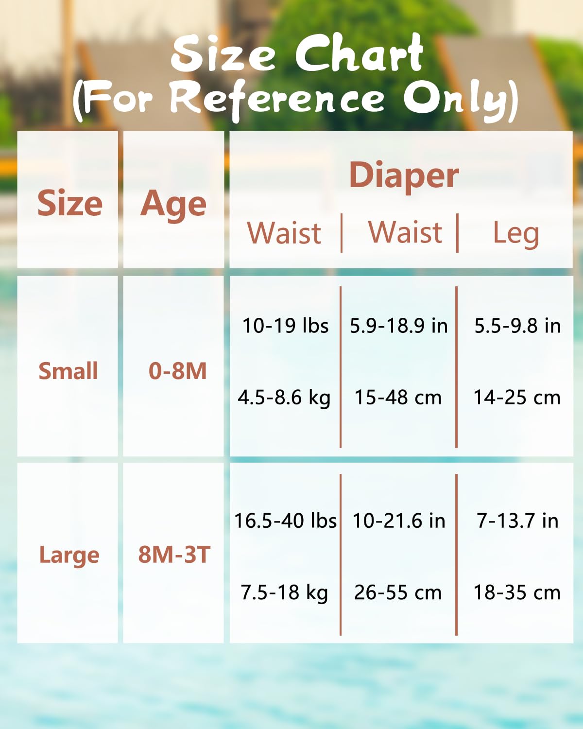 2 Sizes fit for 0-8M Babies or 8M-3T Toddlers: Babygoal reusable swim diapers have small size and large size, which are suitable for babies 0-8M and 8M-3T. They have adjustable snaps and grows with your little one. If your baby is less than 8 months and thin, we suggest you choose small size.