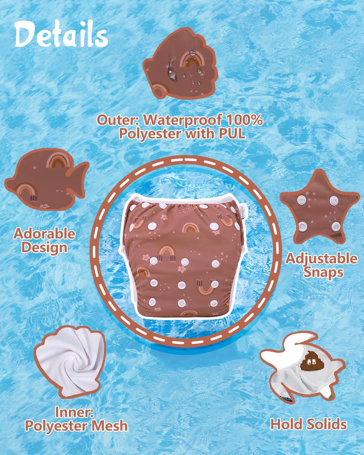 Reusable & Water-proof: These reusable swim diapers are designed to hold solids, not pee. They can be fully machine washable and will get dried faster by the washing machine. The outer layer is made of polyester with waterproof and breathable TPU.