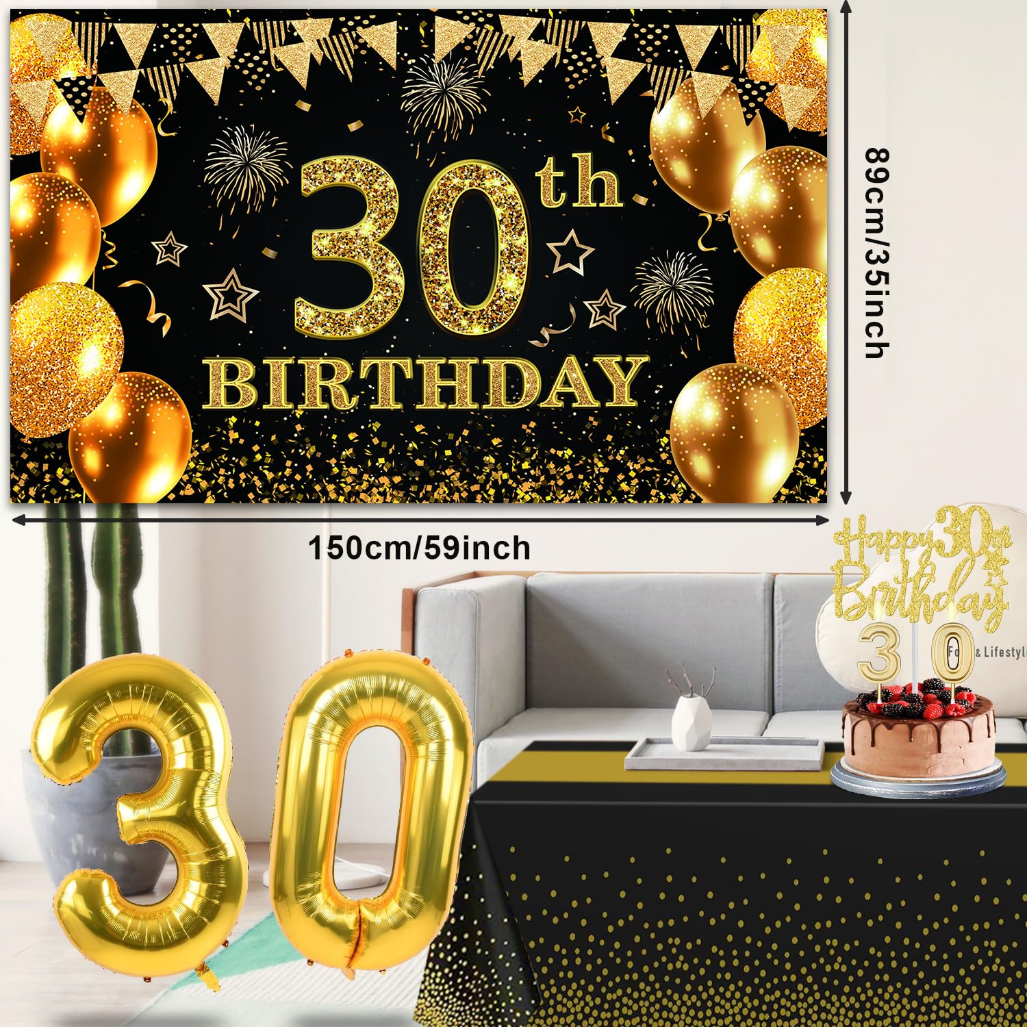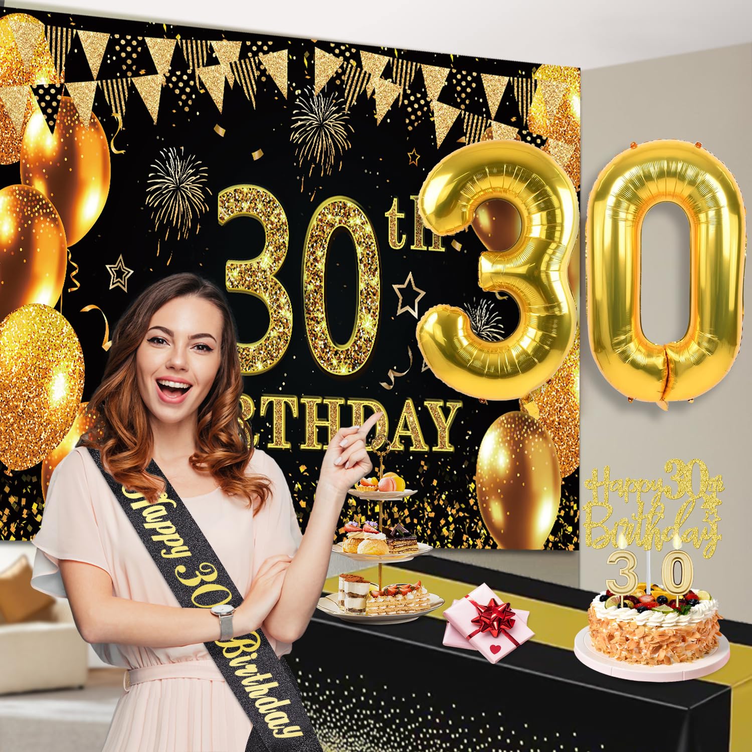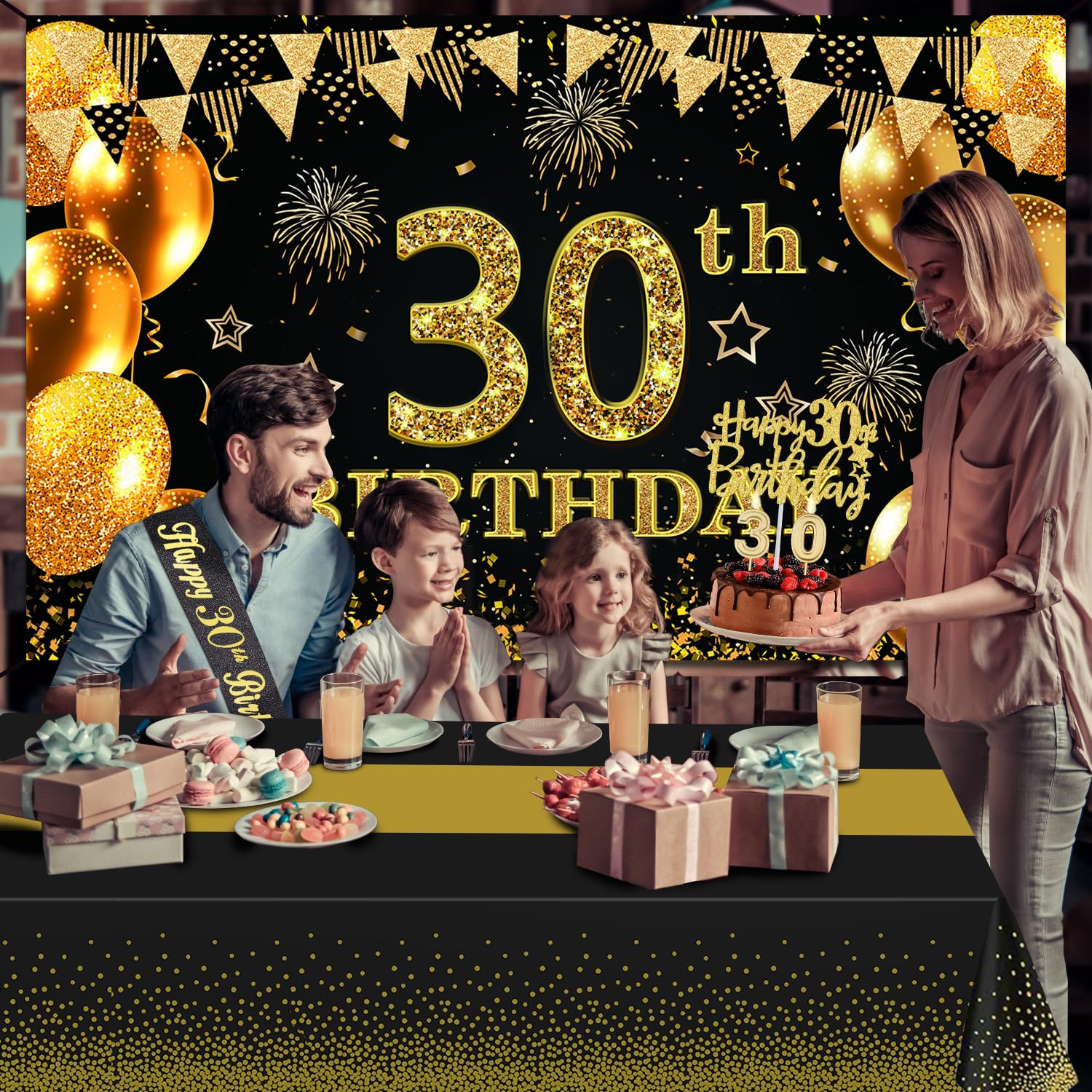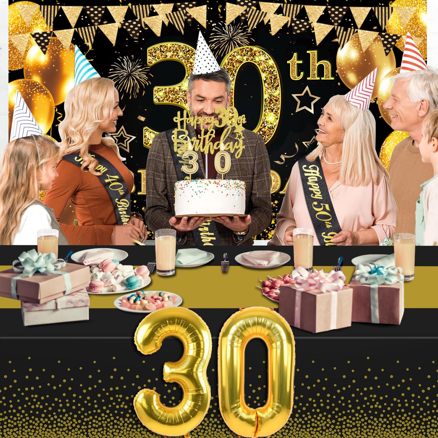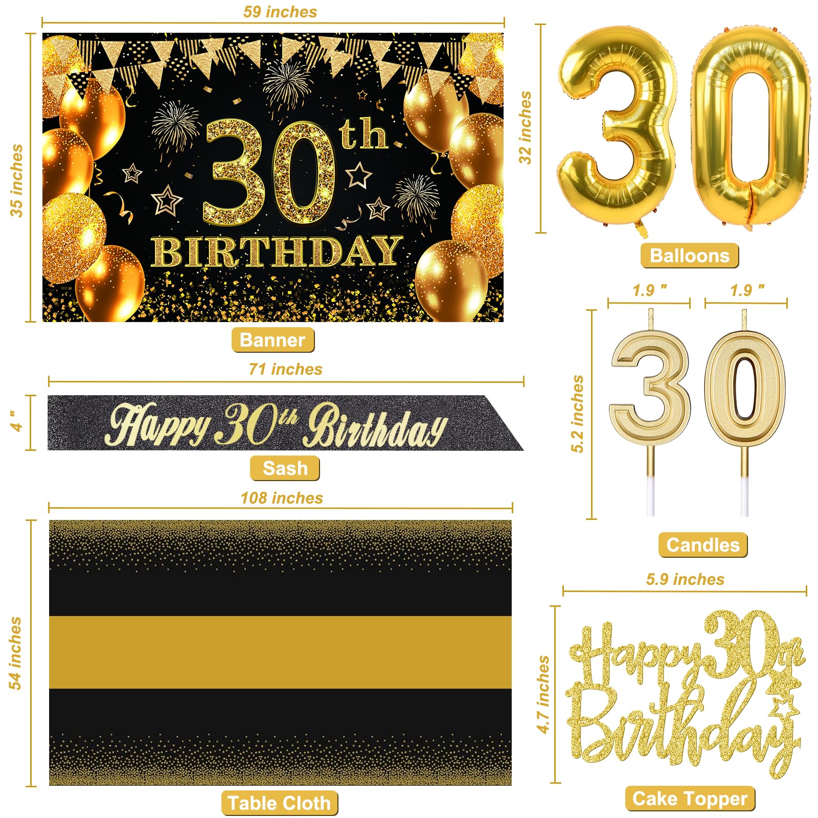 【30th Birthday Decorations Kit】: Packing coming with Large 30th Birthday Banner x 1pc, Big Gold 30th Birthday Balloons x 1set, Black and Gold Table Cloth x 1pc, Black Glittery with Gold Foil Words Happy 30th Birthday Sash x 1pc, 30th Happy Birthday Cake Topper x 1pc, Gold Number 30 Candles x 1set. This Value Black and Gold Party Decorations Set Meet Your Every Needs and Expects in 30th Birthday Milestone