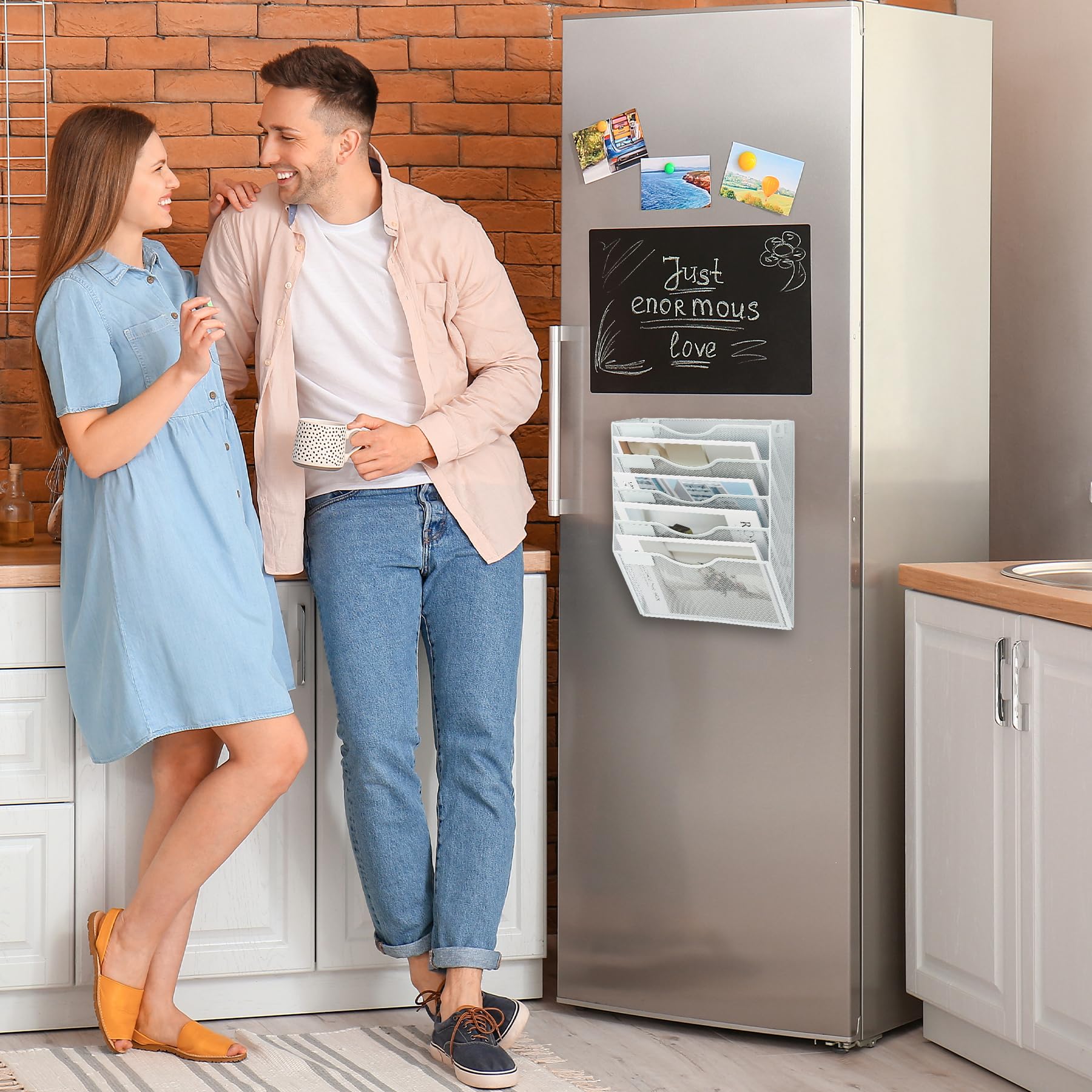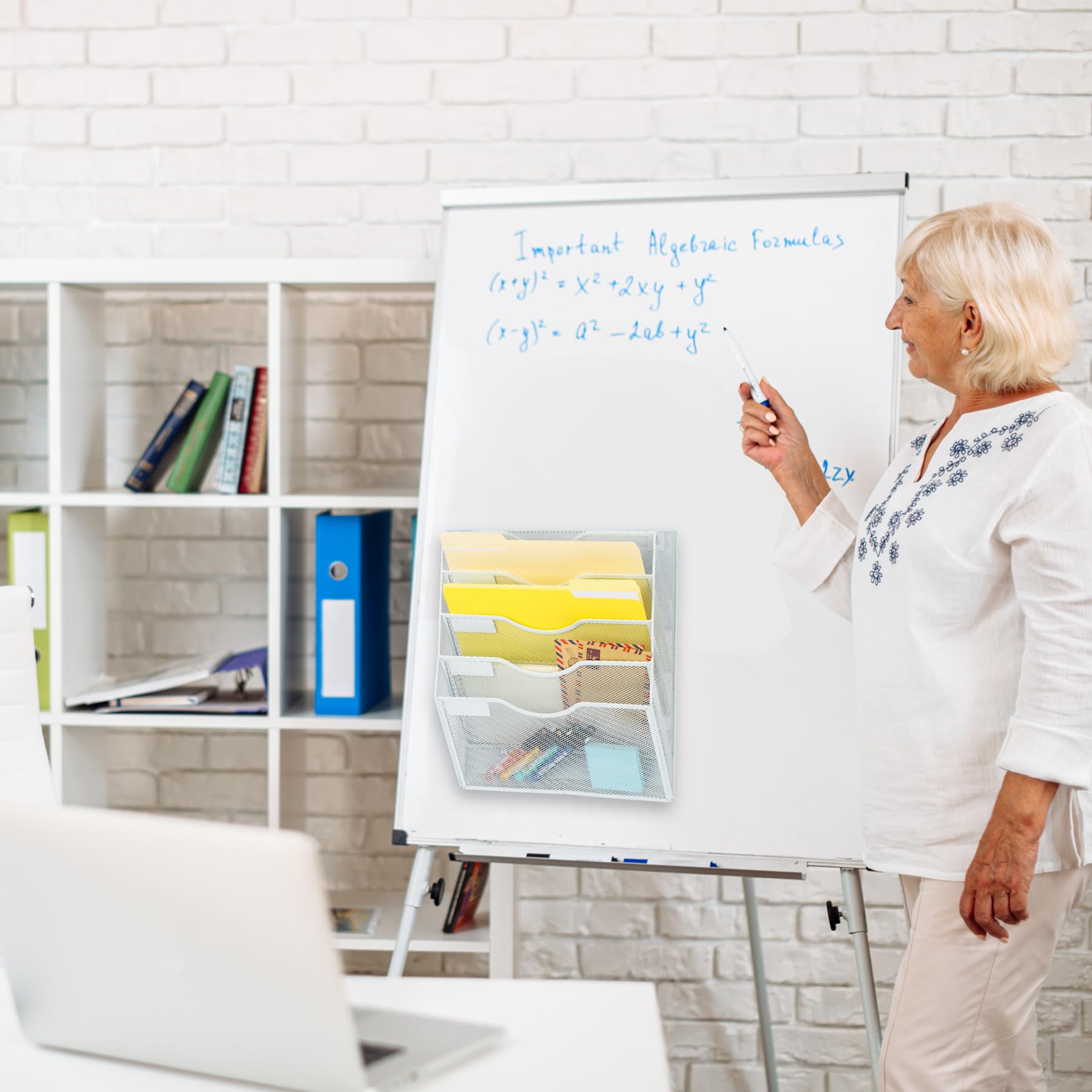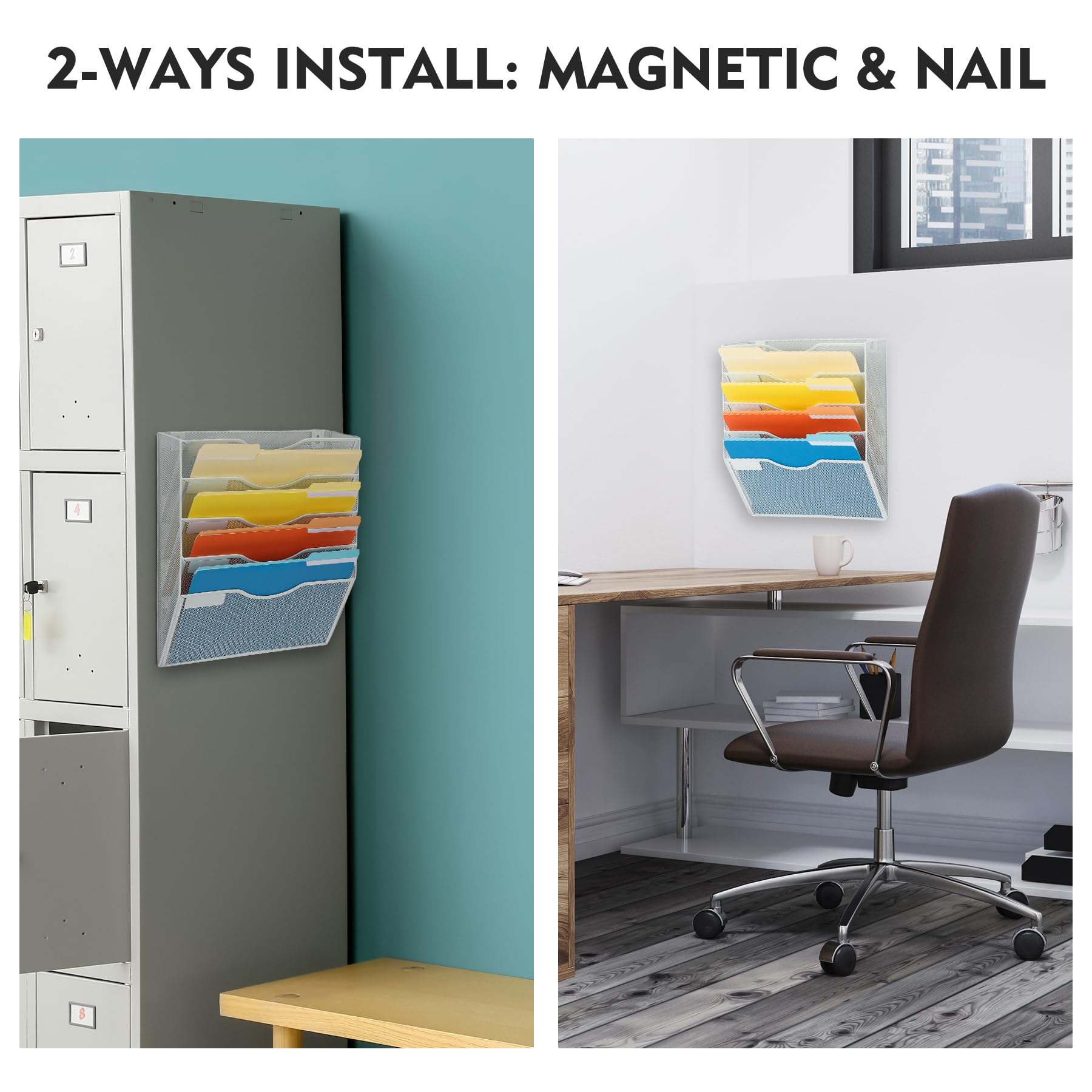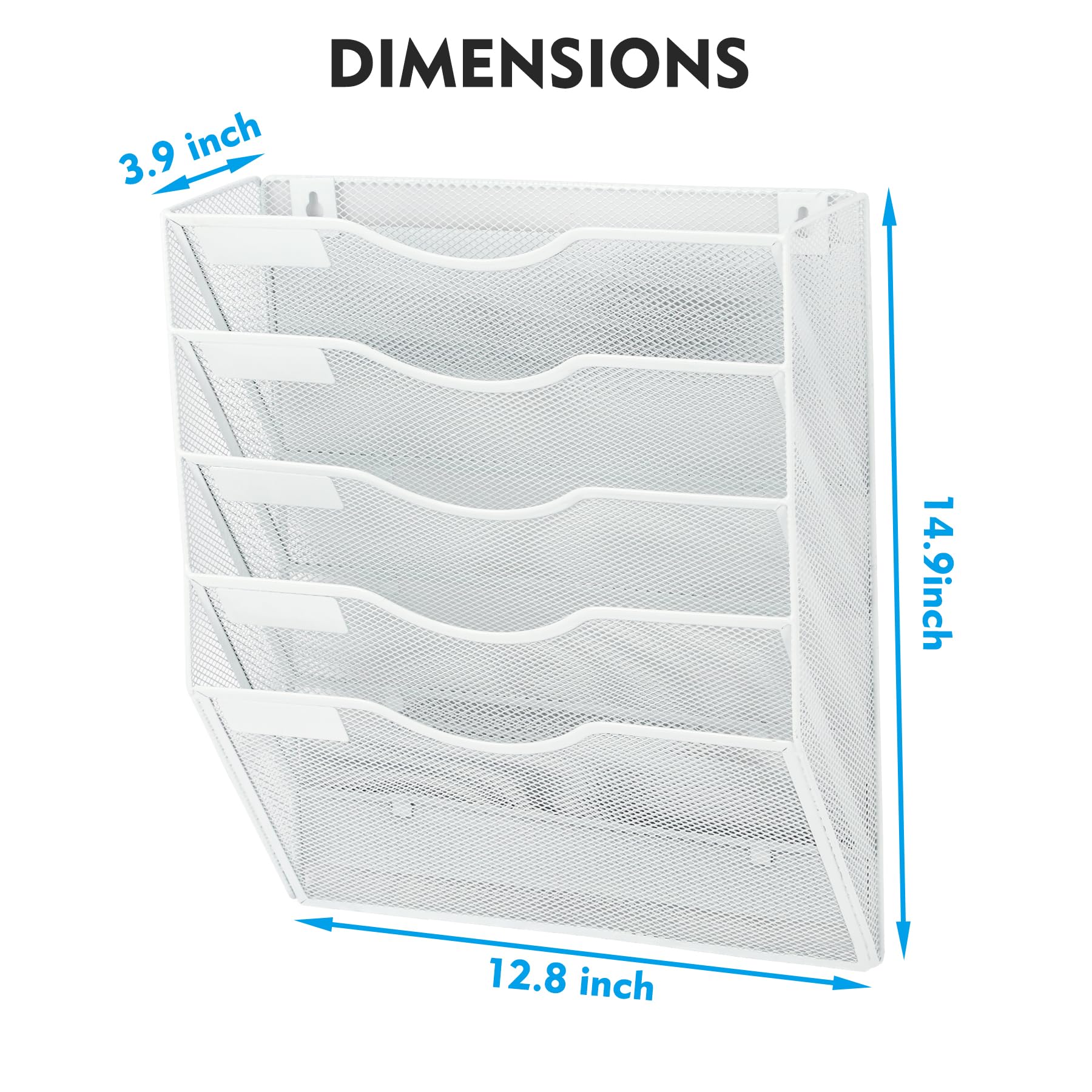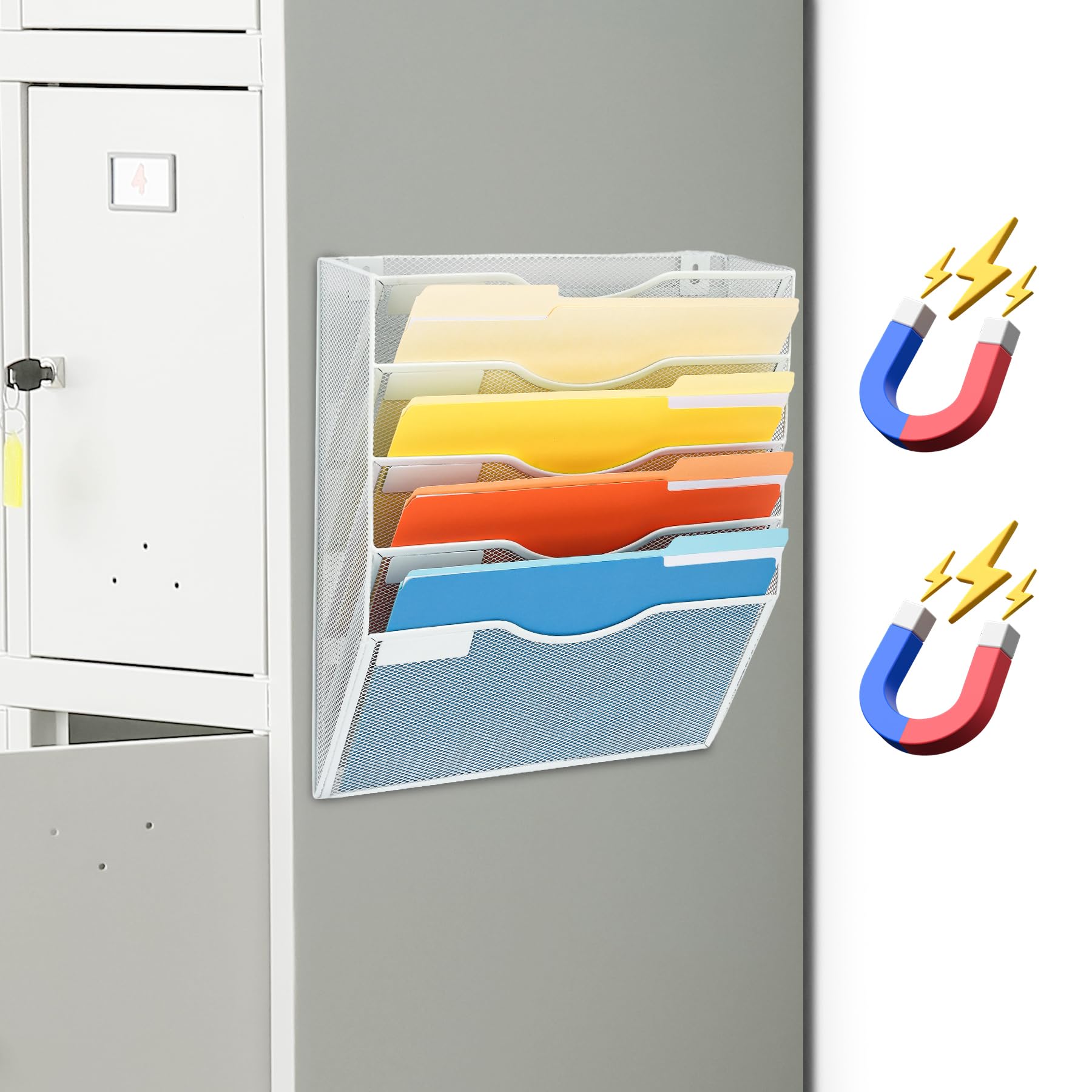 EASEPRES 5 Pockets Wall File Holder Organizer Hanging Magazine Rack, White Organizer Your Files Get your papers, mail and stationery items in order by filing them tidily in our vertical mounted wall file holder. The stylish mesh arched design allows easy access to files and retrieval. Space Saving Separate your files and papers into 5 stacked tray levels with label panels allow for labeling contents of each slot so you know where all of your important paperwork and spare paper is stored. Each compartment can take letter paper sizes which is ideal for busy offices and work environments. Use our wall mount mail holder for letters, files, forms and worksheets.