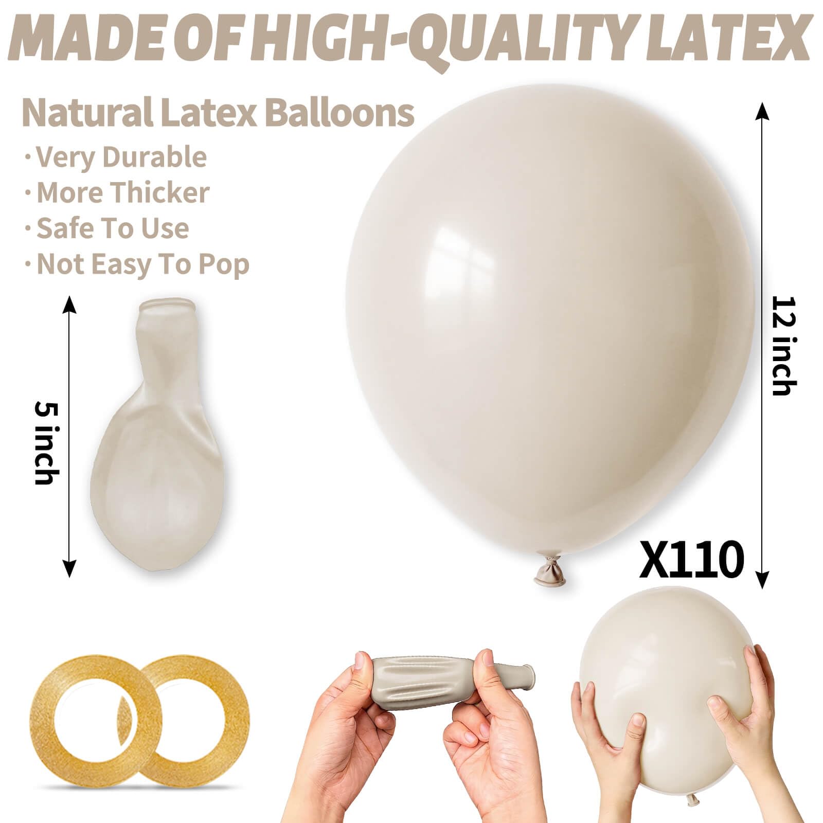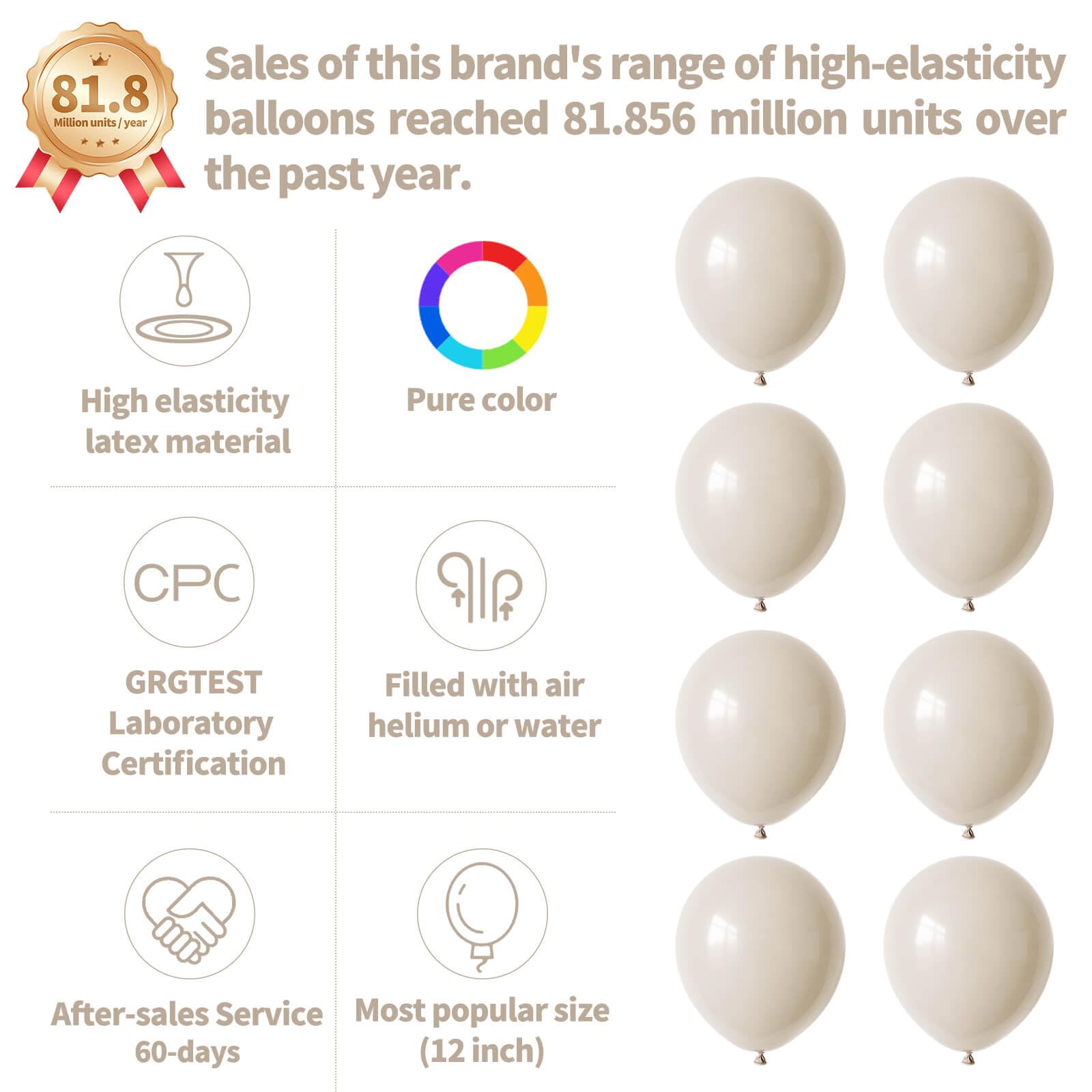 Our sand white latex balloons 12 inch are made of thickened latex, the color is bright sand white, these sand white balloons can be used as balloons decorations for birthday party, and play around children.