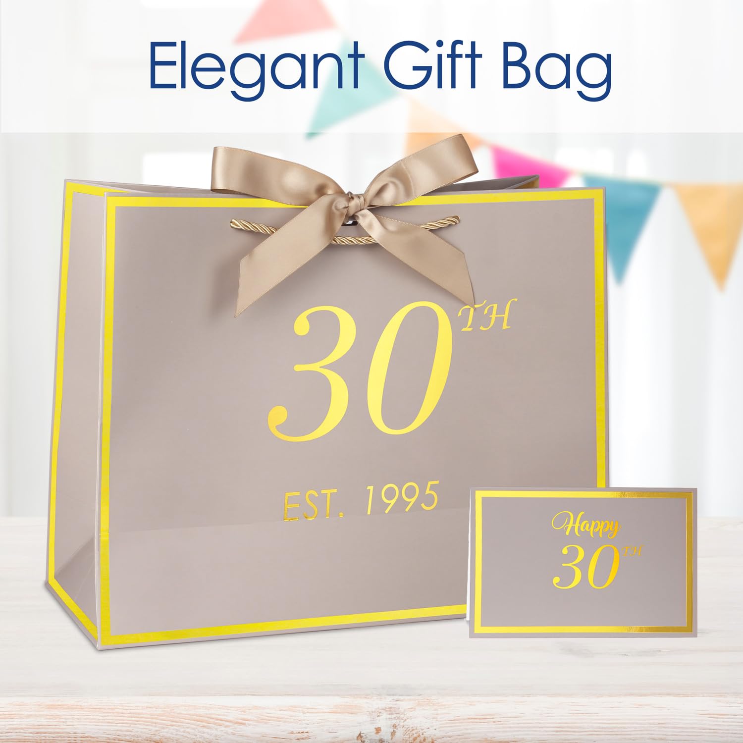 Personalized 30th Birthday Decorations for Him & Her: Each 30th birthday gift bag comes with 1 matching greeting card and 2 tissue papers.. The gift bag measures 13" length × 10.2" height × 5.2" width, the greeting card measures 7.9" length × 5.9" width, and the tissue paper measures 22.83" length × 22.83" width, providing a stylish presentation for your gifts.
