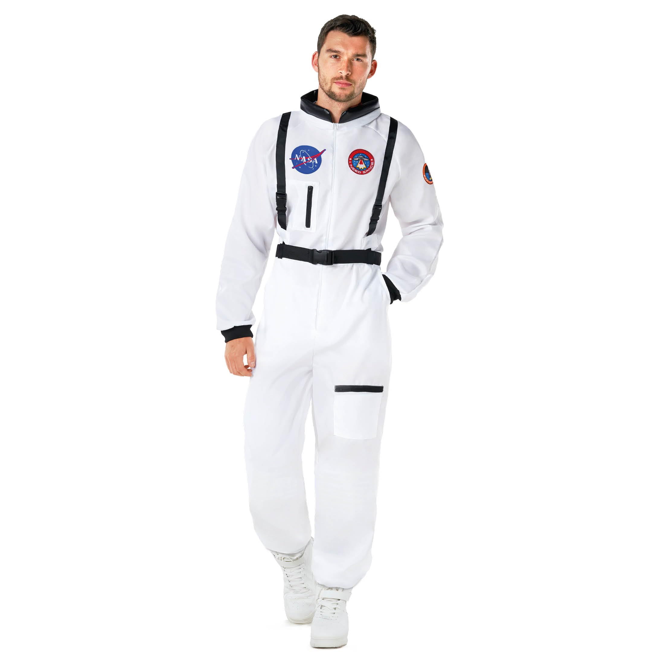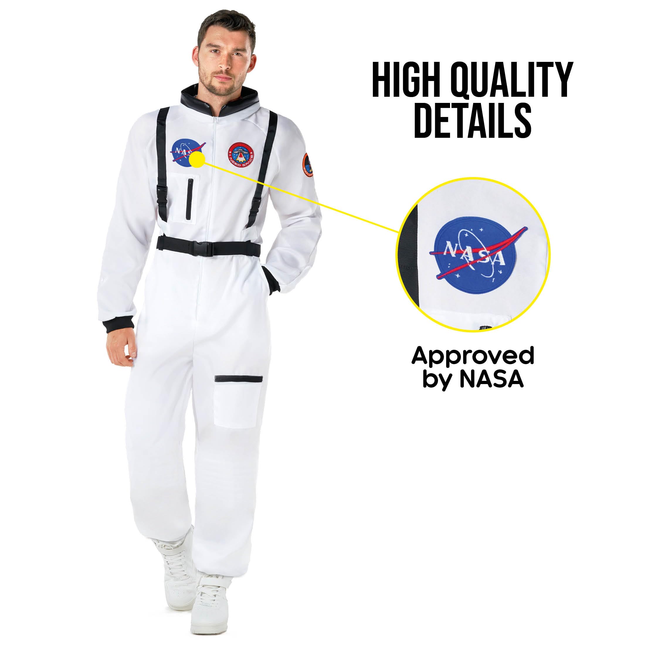 Complete astronaut look: Includes a crisp white all-in-one space suit jumpsuit featuring authentic NASA-style embroidered badges, front zip closure, and adjustable buckled belts for a realistic finish.