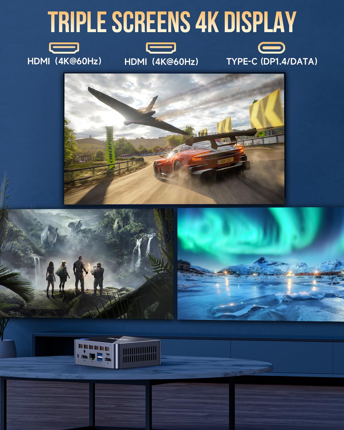 【Triple 4K Display Output】GMKtec M3 Plus supports up to Triple 4K displays through dual HDMI and one Type-C (DP1.4/DATA) ports. Triple-screen output enhances productivity, allowing for seamless multitasking, extended workspace, and superior visual clarity, ideal for professionals in content creation, programming, or finance business solutions