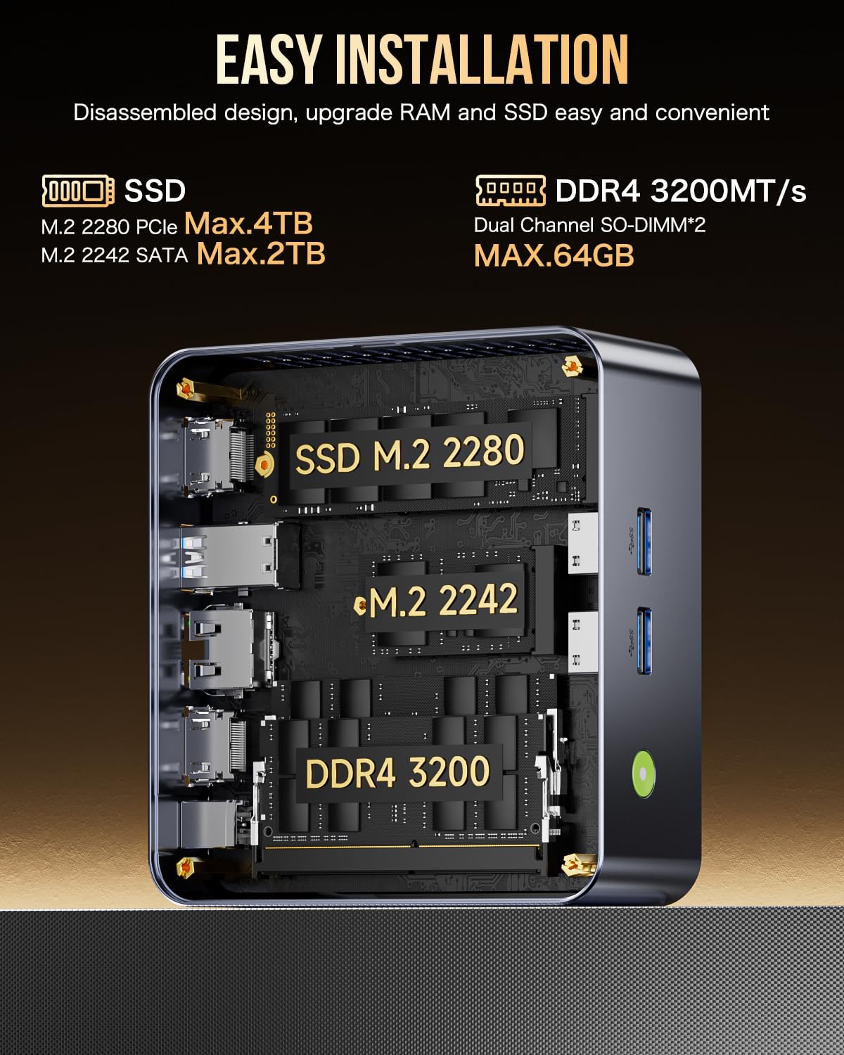 【32GB DDR4 RAM & 1TB Storage】Equipped with dual 32GB DDR4 RAM, M3 Plus mini PC supports memory expansion up to 64GB, ensuring high-speed performance for intensive tasks. The 1TB M.2 PCIe 2280 SSD offers ample storage, expandable to 4TB. Additionally, there is support for a second M.2 SATA/PCIEX4 2242 drive with expansion up to 4TB, providing flexibility for data-heavy applications