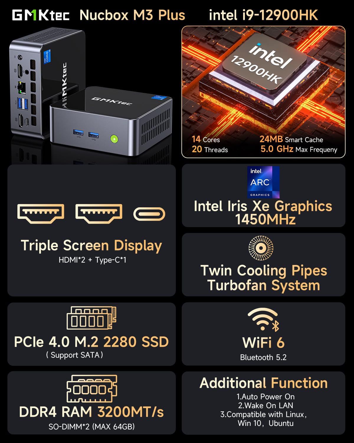 【Intel Core i9 12900HK CPU】M3 Plus is powered by the Intel Core i9 12900HK processor with 14 cores/20 threads, base speed 2.50GHz and can reach a max turbo frequency of 5.0 GHz, with 24 MB of cache. The TDP can reach 45W, offering a powerful balance between performance and efficiency. Upgraded performance compared to Core i9 12900H, Ryzen 7 7840HS
