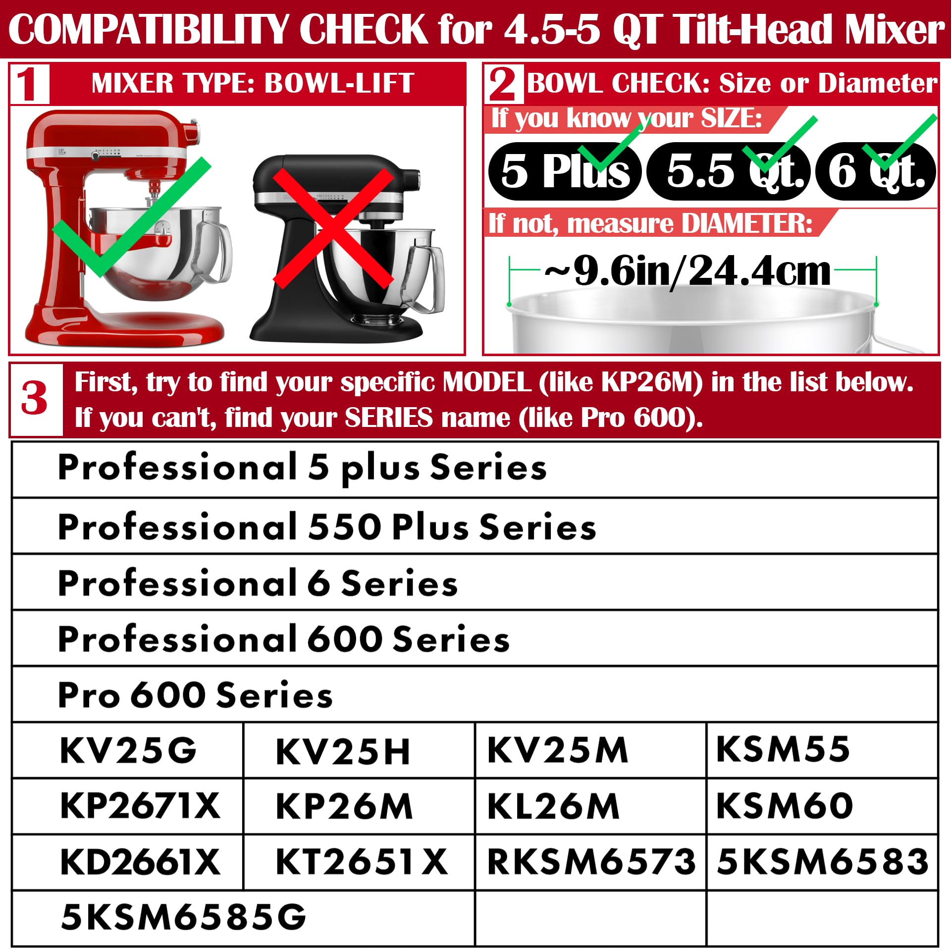 Designed for Kitchen Aid 5plus-6qt Bowl-Lift Stand Mixers(Not a KitchenAid Original): Professional 5 PlusSeries, Professional 550 Plus Series, KV25G, KV25H,KV25M, KSM55, Professional 600 Series, Pro 600 Series, Professional 6 Series, KP2671X, KP26M, KL26M, KSM60 KD2661X, KT2651X, RKSM6573, 5KSM6583, 5KSM6585G