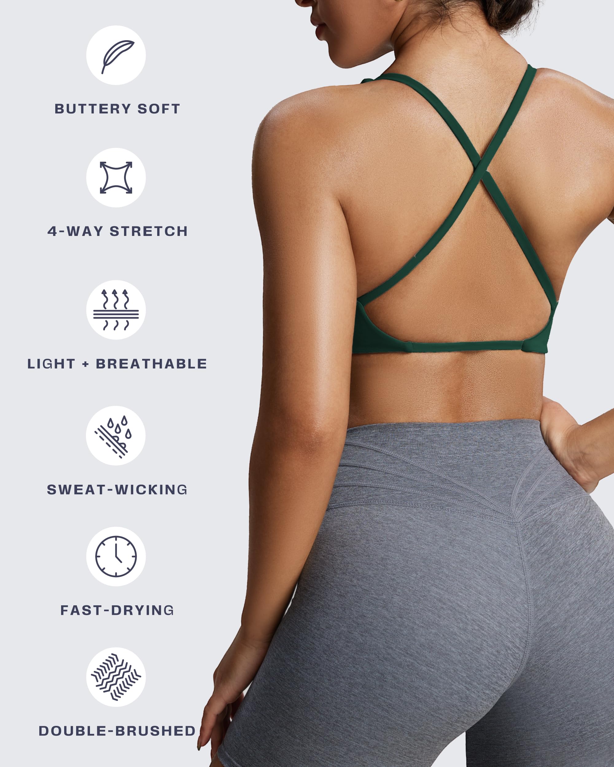 The Sienna twist womens sports bra featuring thin crossed back straps and padding, despite small straps, it doesn’t bite into your traps and cause neck pain
