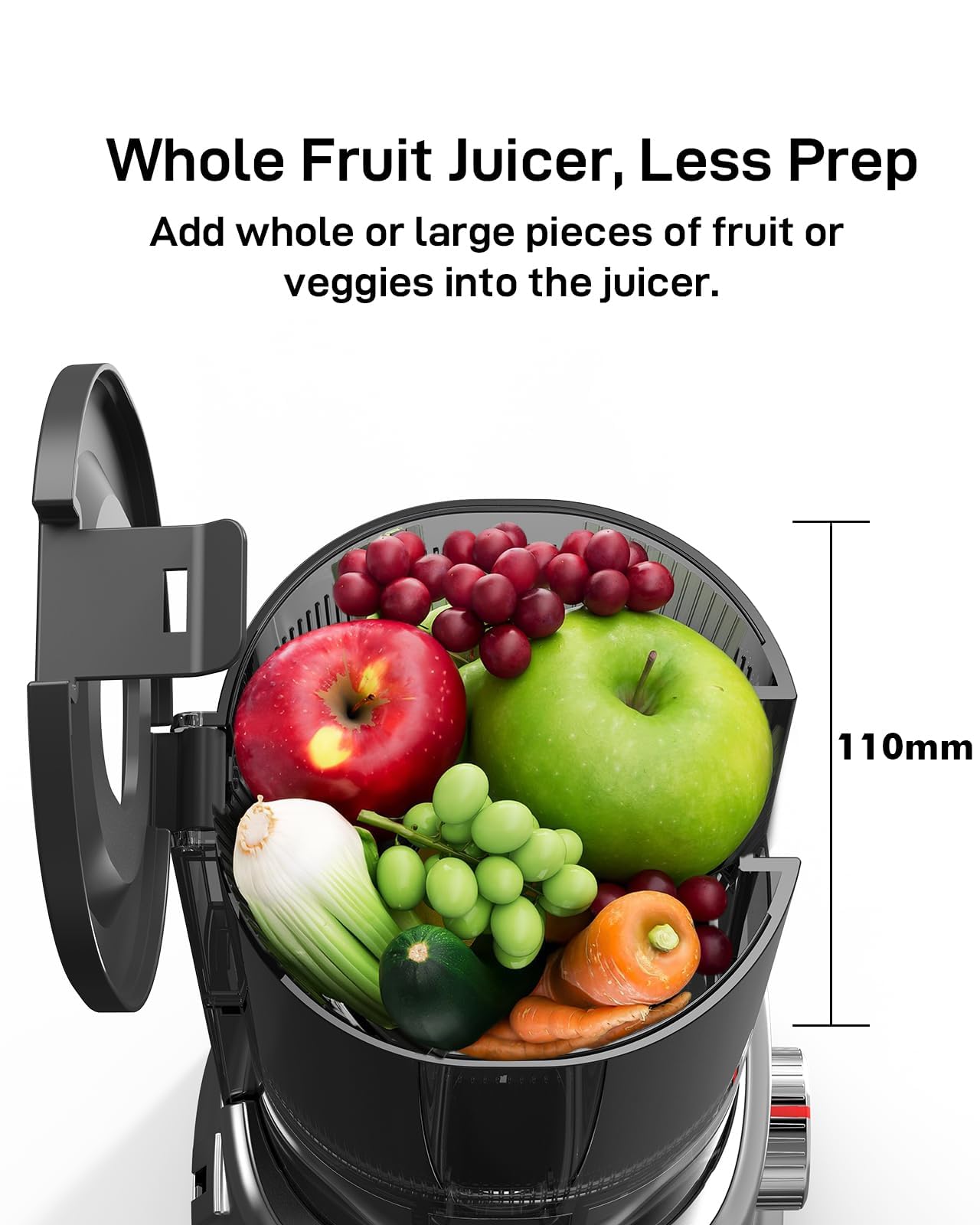 Extra Wide 110mm Feed Chute – Less Prep, More Juice - Fit whole apples, carrots, and celery with minimal cutting. Enjoy faster juicing for busy mornings or family gatherings. Some large or fibrous produce may require light prepping