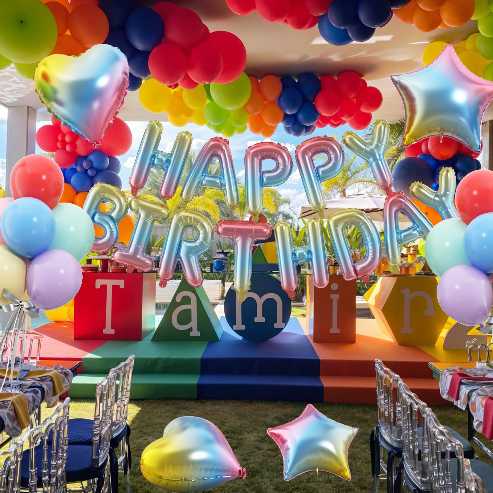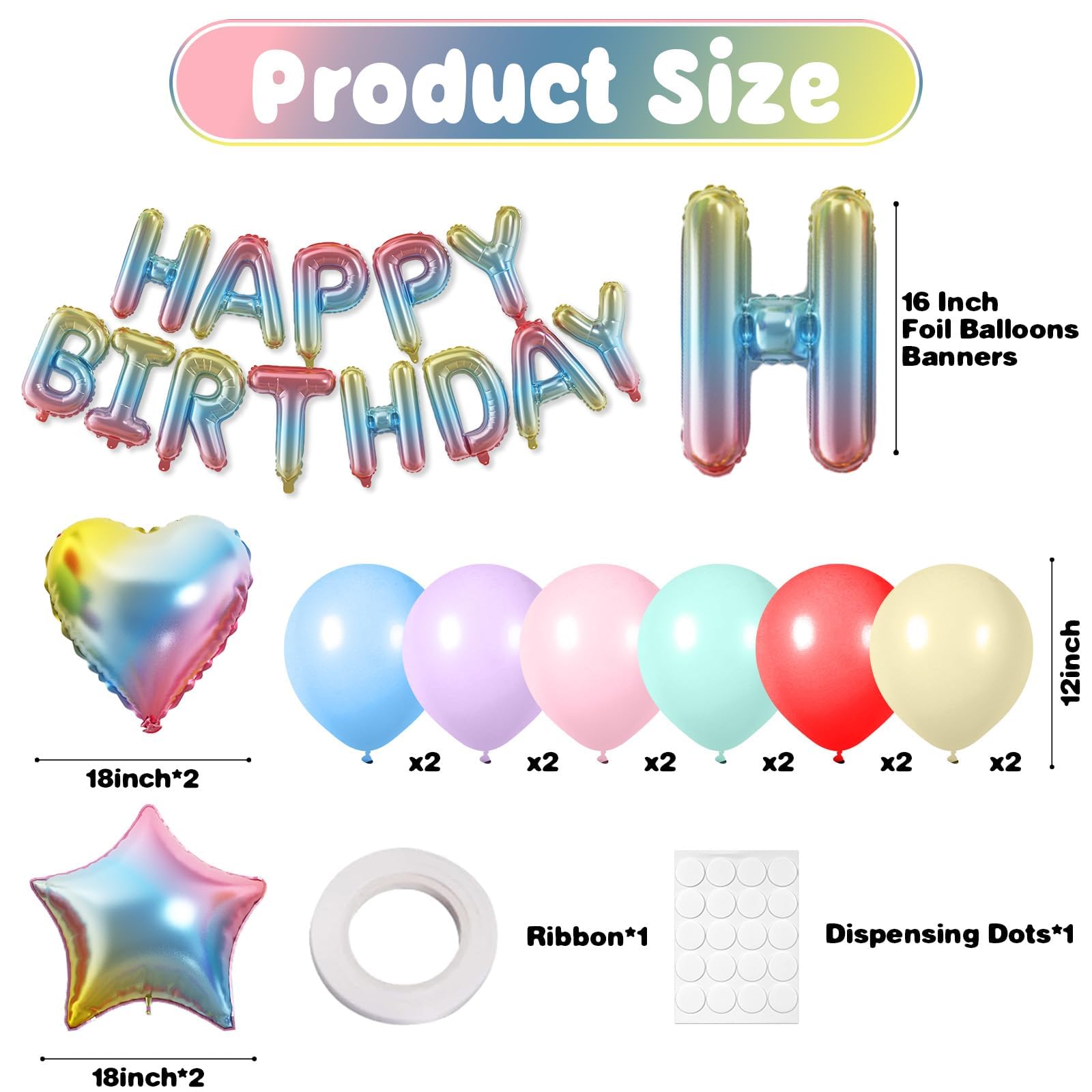 【Package Contains】In Paready Gradient HAPPY BIRTHDAY Balloons set, you'll receive: 1 x 16 inches gradient "HAPPY BIRTHDAY" foil balloon banner, 2 x 18 inches gradient star foil balloons, 2 x 18 inches gradient heart foil balloons, 4 x 12 inches maca pink/purple balloons, 4 x 12 inches maca green/light blueballoons, 4 x 12 inches maca red/ yellow balloons, 1 roll of 10m white ribbons, 1 balloon dispense, 1 straw for easy inflation.