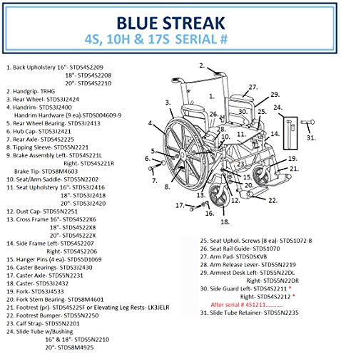 Drive Medical Blue Streak lightweight wheelchairs for adults and seniors feature cutting-edge design elements like swing-away elevating leg rests, calf straps, and detachable desk arms that flip back for easy transfers. These portable, lightweight wheelchairs feature a 20-inch padded seat ergonomically crafted for comfort and a convenient seatback pocket. The detachable tires, made of solid rubber and mounted on composite wheels, ensure a consistently smooth ride and feature push-to-lock functionality for extra safety. The sleek blue-powdered wheelchair frame is finished with durable steel and supports up to 300 pounds. The black cross brace and nylon seat upholstery are sturdy, lightweight, and easy to clean. Wheelchair easily folds to a compact 12.5-inch width, and at just 41.25 pounds, the folding wheelchair can be lifted to trunk or storage. Backed by a limited three-year warranty and from Drive Medical, a leading brand of mobility aids, bath safety products, and other medical goods for more than 20 years, you can purchase with confidence.