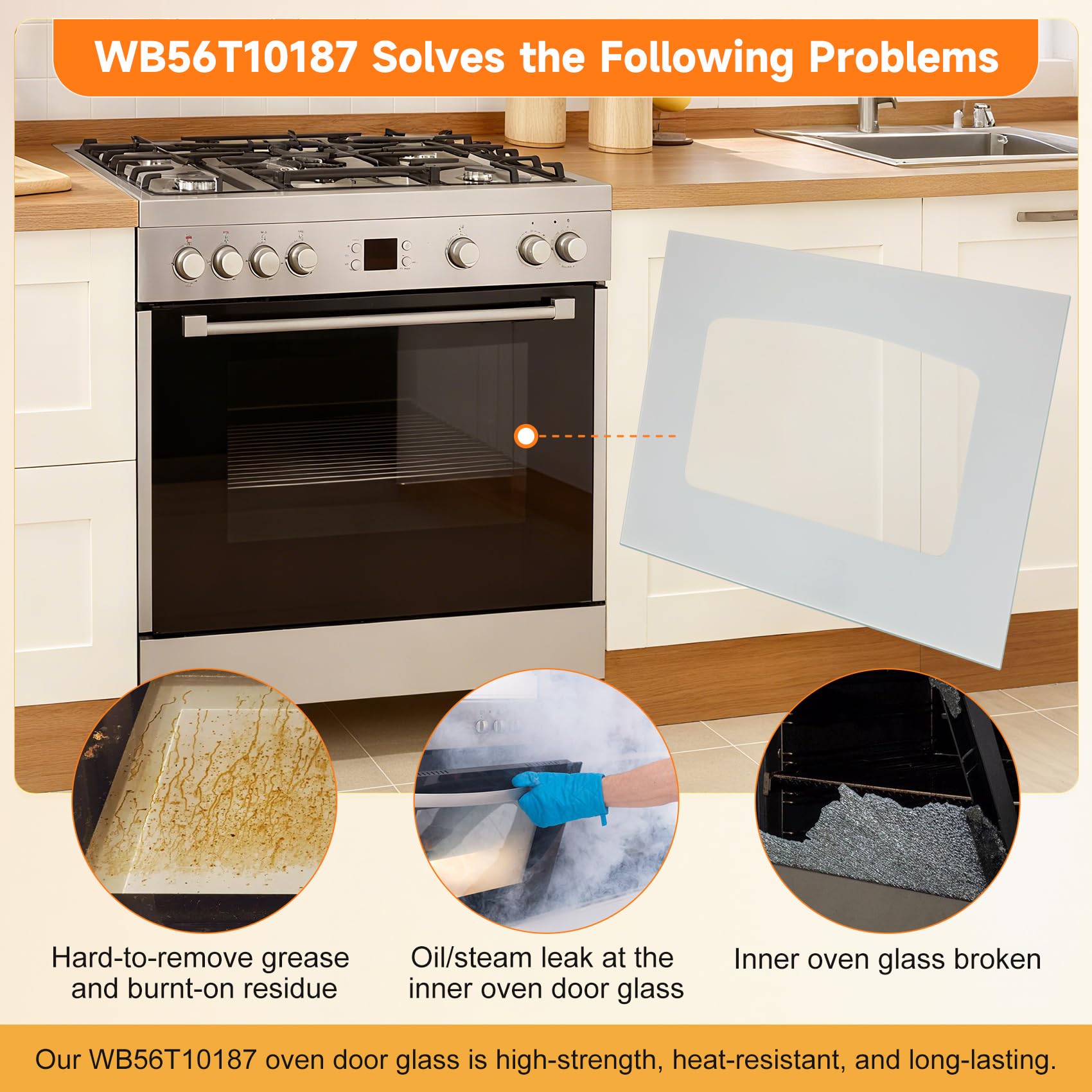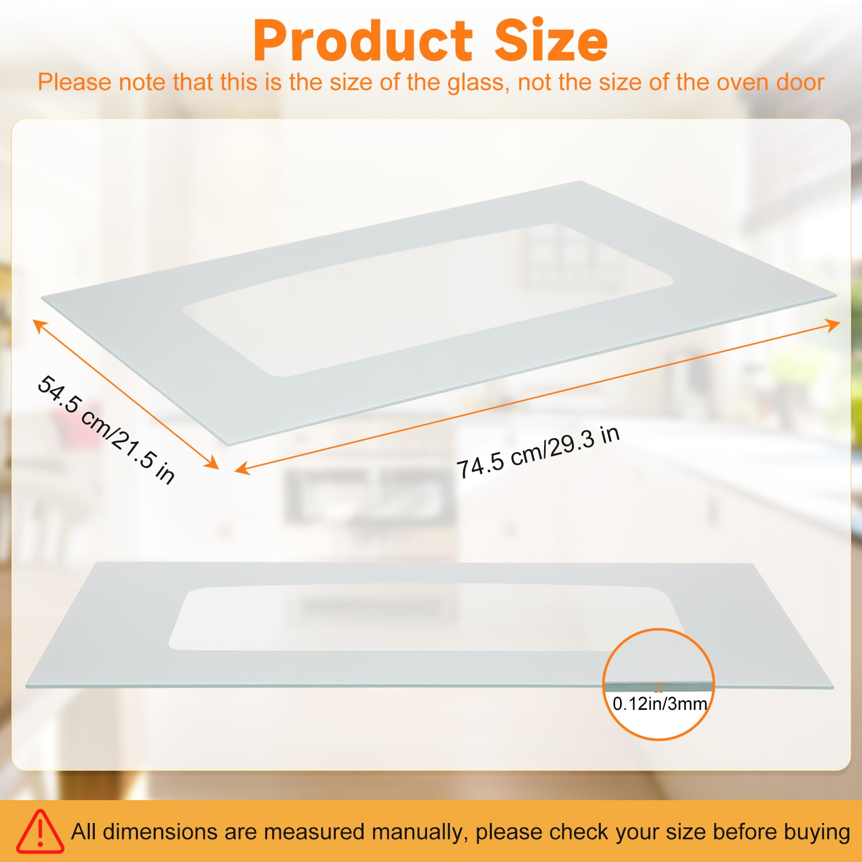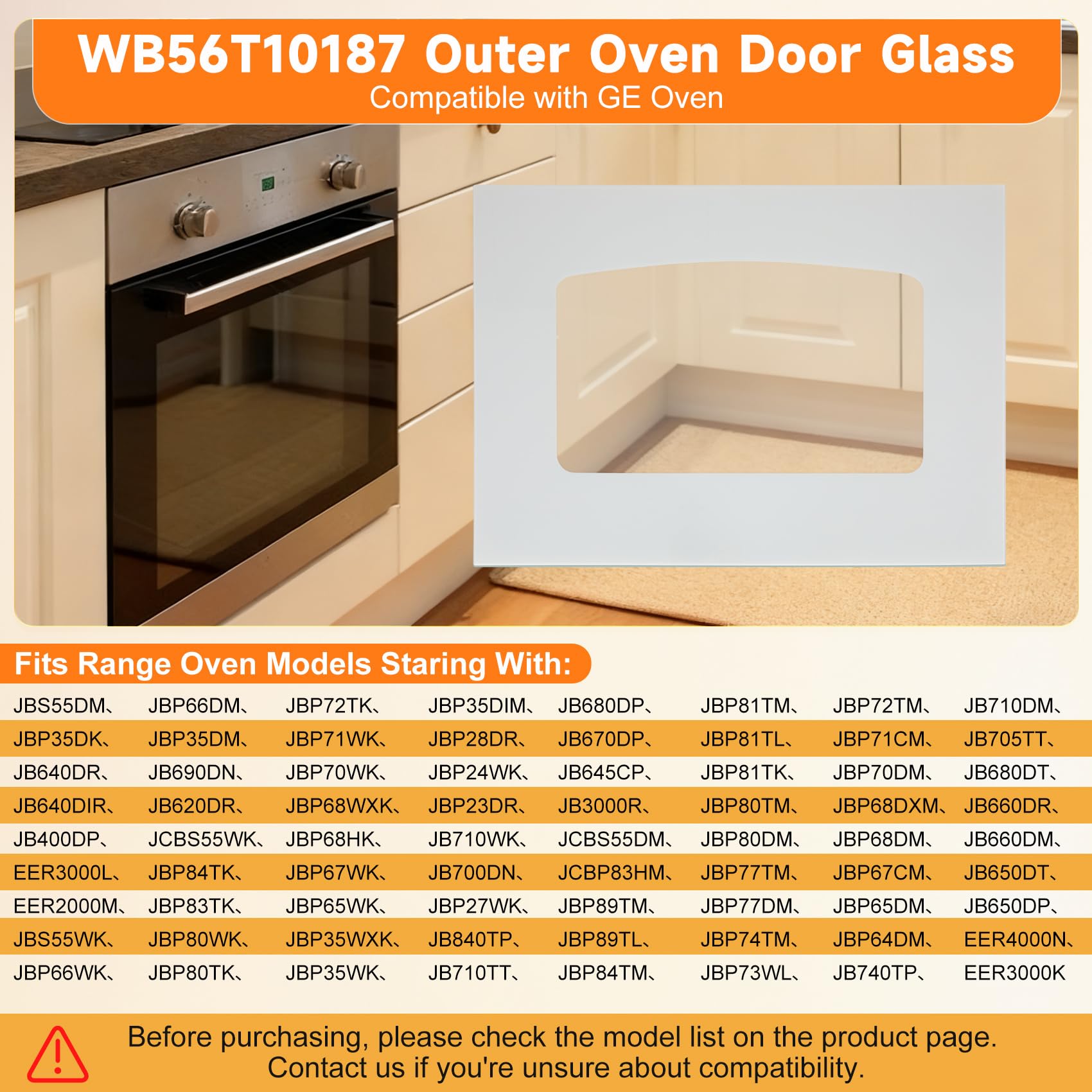 Upgraded WB56T10187 Outer Oven Door Glass: WB56T10187 range oven door glass size is 29.3 "(L) x 21.5" (W), thickness is 3mm. This oven door glass is designed to perfectly fit GE Series/Stove/Oven. Before purchasing, please measure or verify the size and model of your oven glass door to ensure it matches the WB56T10187 door glass.