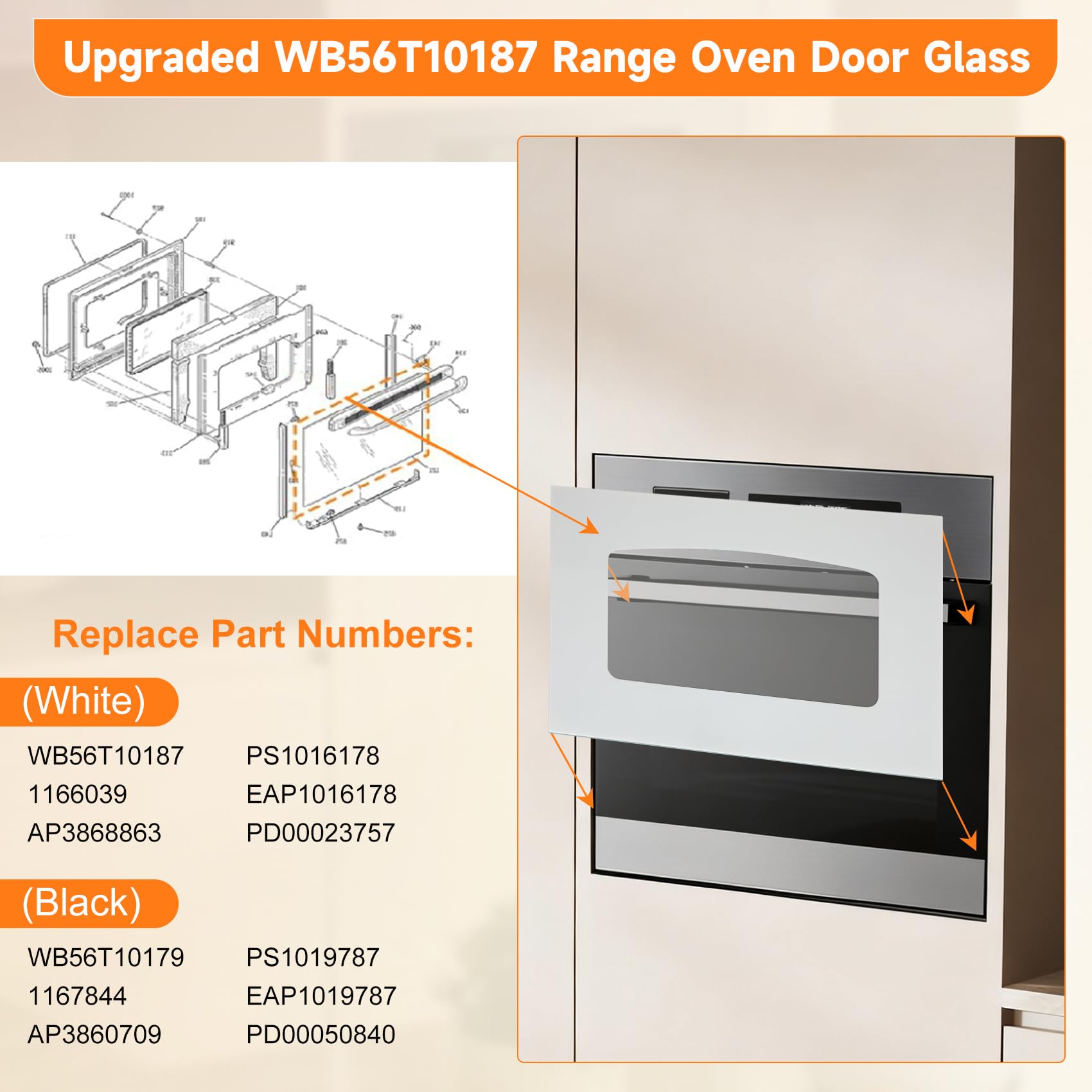 Part Number: WB56T10187 oven Door Glass Replacement Part Number: WB56T10187, 1166039, AP3868863, PS1016178, EAP1016178, PD00023757. WB56T10187 stove glass is also compatible with the black version model WB56T10179, 1167844, AP3860709, PS1019787, EAP1019787, and PD00050840. Aside from the color difference, both have identical dimensions and can be used interchangeably.
