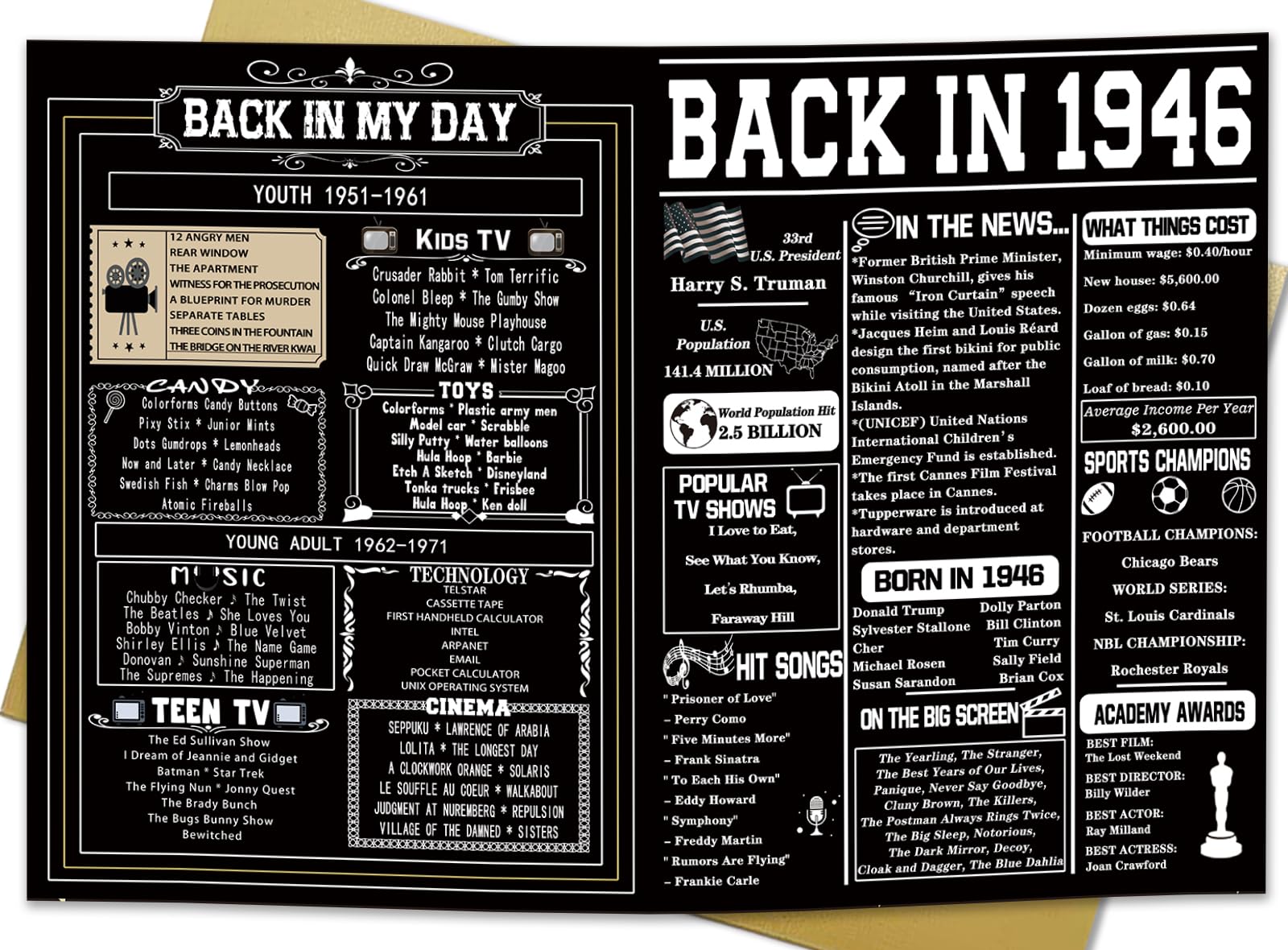 FUN MEMORY - This card contains popular TV shows, famous people born, hit songs, filled with news and events from the past.