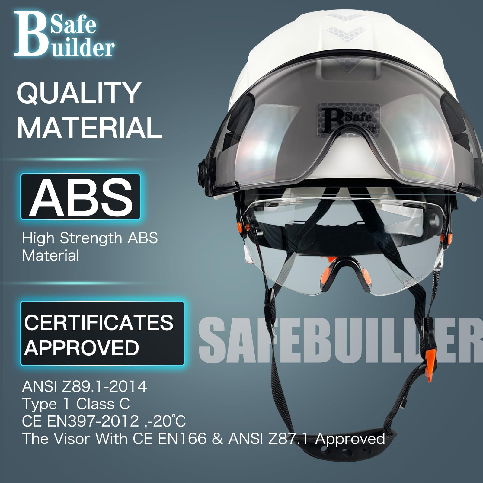 【Certificates Approved】: SAFEBUILDER Work Hard Hat meet ANSI Z89.1-2014 ,Type 1 Class C Standards, Also meet CE EN397-2012 ,-20℃.The visors with CE EN166 & ANSI Z87.1 Approved. Can be used in Construction, Industrial , Decoration, Outdoor Work ,Rescue ,Electricity, Mining and other places To get Head Protection, Improve the work safety Level and workers Get Happy daily working time.
