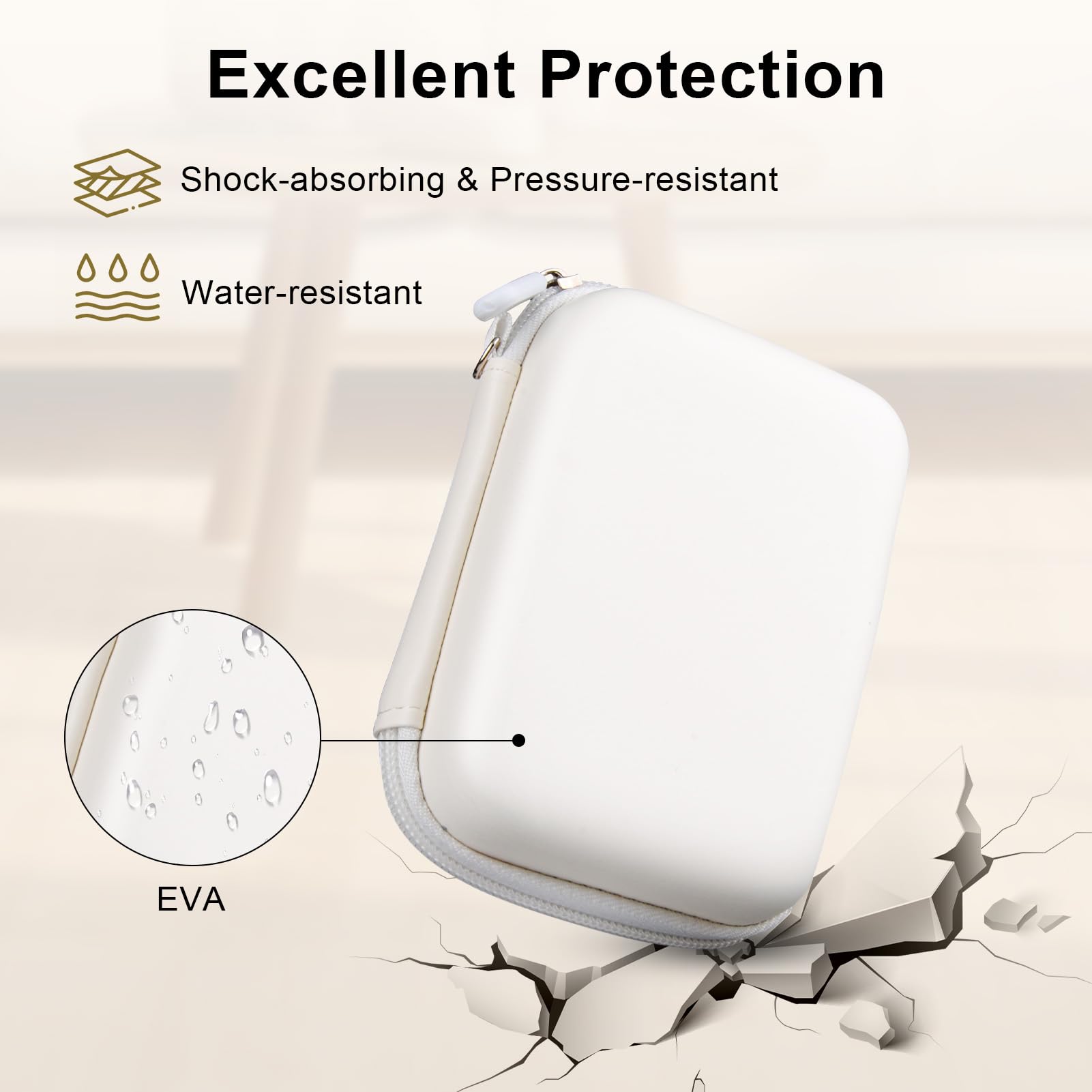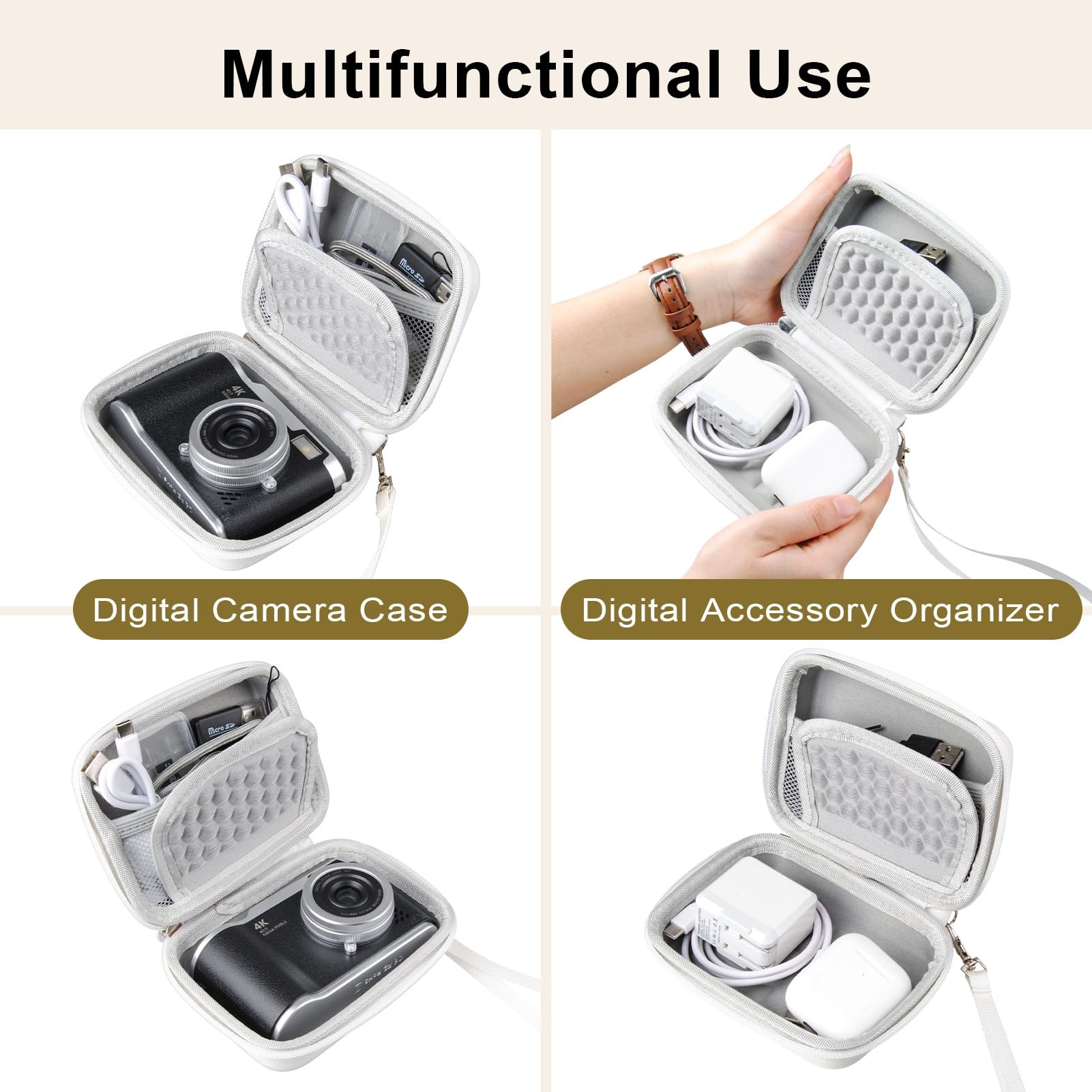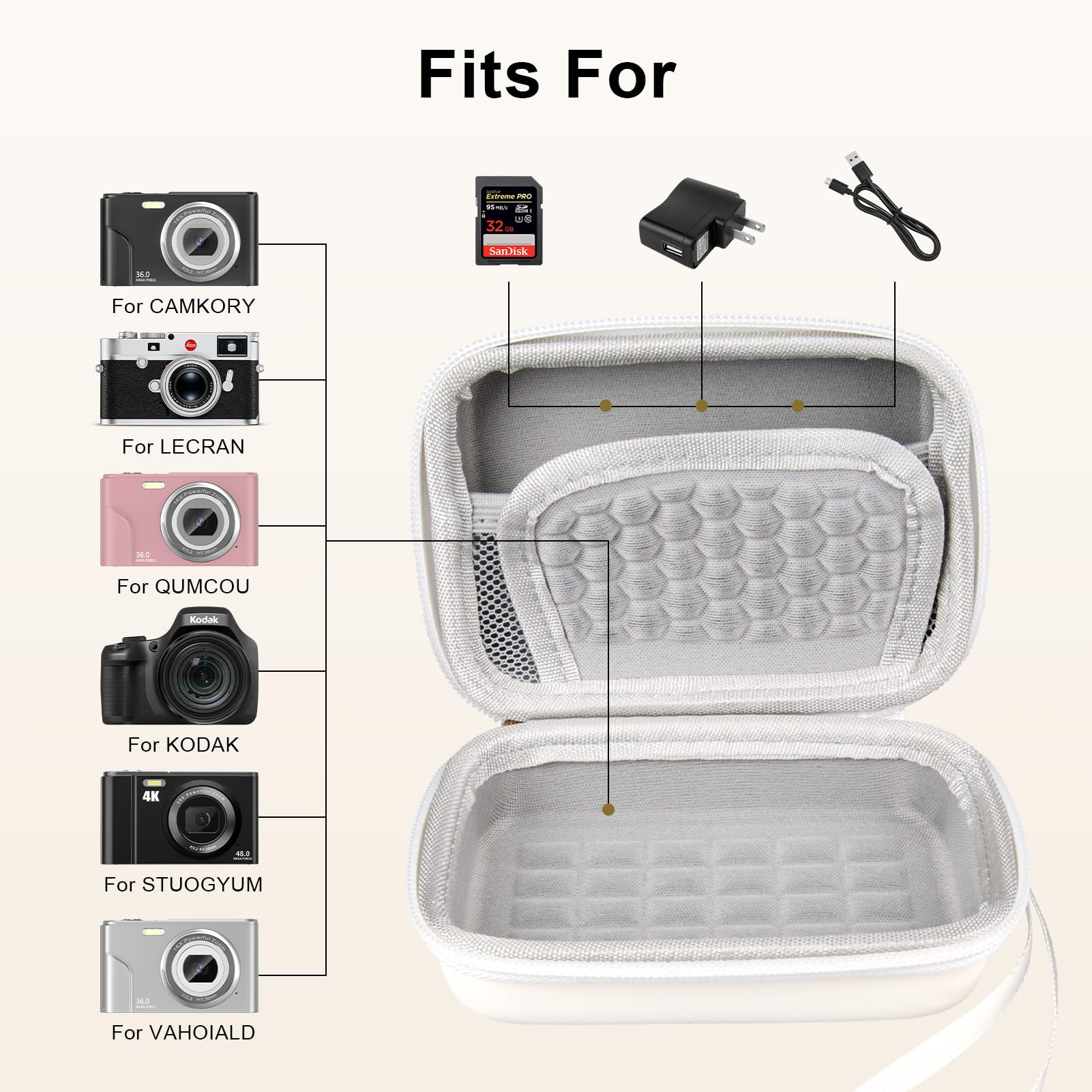 Description Digital Camera Case, Portable Hard EVA Case, Protective Hard Camera Case Travel Carrying Case Camera Storage Case Specification: Materials: Hard EVA Materials External dimensions: 5.13*3.94*2.05inch Interior dimensions: 4.33*3.15*1.77inch Color: White weight: 68g Package Included: 1 x Camera carrying protective bag in white 1 x Sling with metal hooks Perfect Fit: This camera hard carrying case is compatible with KODAK PIXPRO FZ45/FZ55, CAMKORY, Lecran, Canon IXUS, and other compact cameras. Compact and portable, it easily fits into pockets or backpacks. Excellent Protection: The camera protective case features a rugged EVA shell for waterproof, shockproof, and pressure-resistant protection. Its interior prevents scratches. Multifunctional Use: Come with a mesh pocket, camera hard carrying case is deal for protecting cameras and accessories like chargers, USB drives, or headphones, —perfect for travel.