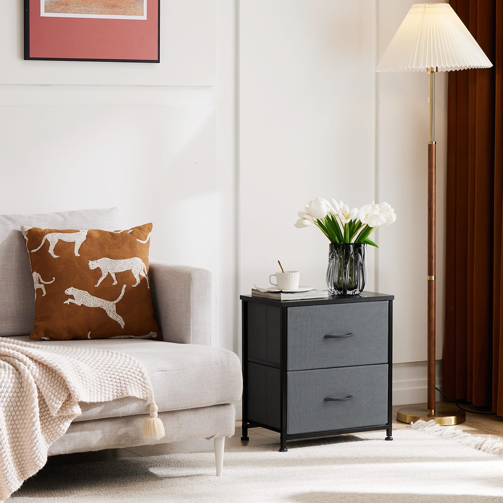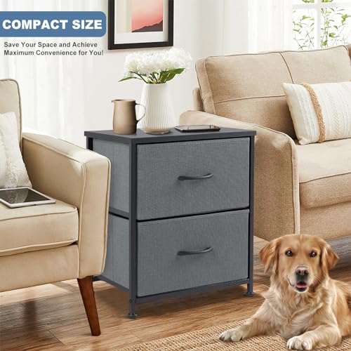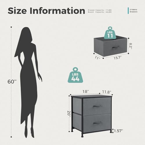 【Nightstand for Bedroom】The nightstand with 2 storage drawers is a versatile and functional piece of furniture that offers ample space for organizing and storing various items. Whether it's clothes, accessories, or miscellaneous items, the drawers allow for easy organization and quick retrieval of items when needed. With a height of 20 inches, it is the perfect size for placing next to a bed, providing easy access to essentials, such as books, glasses, and a lamp.