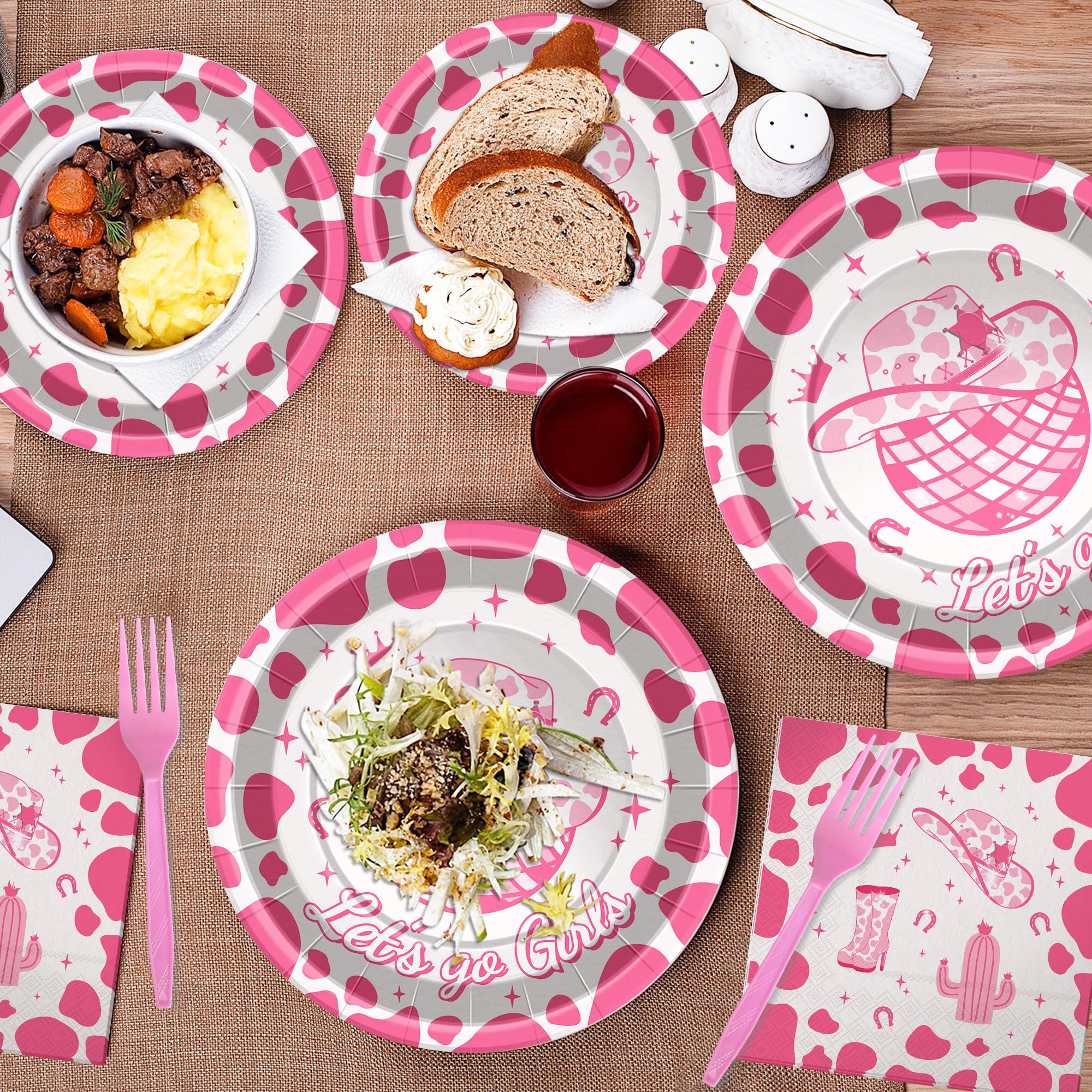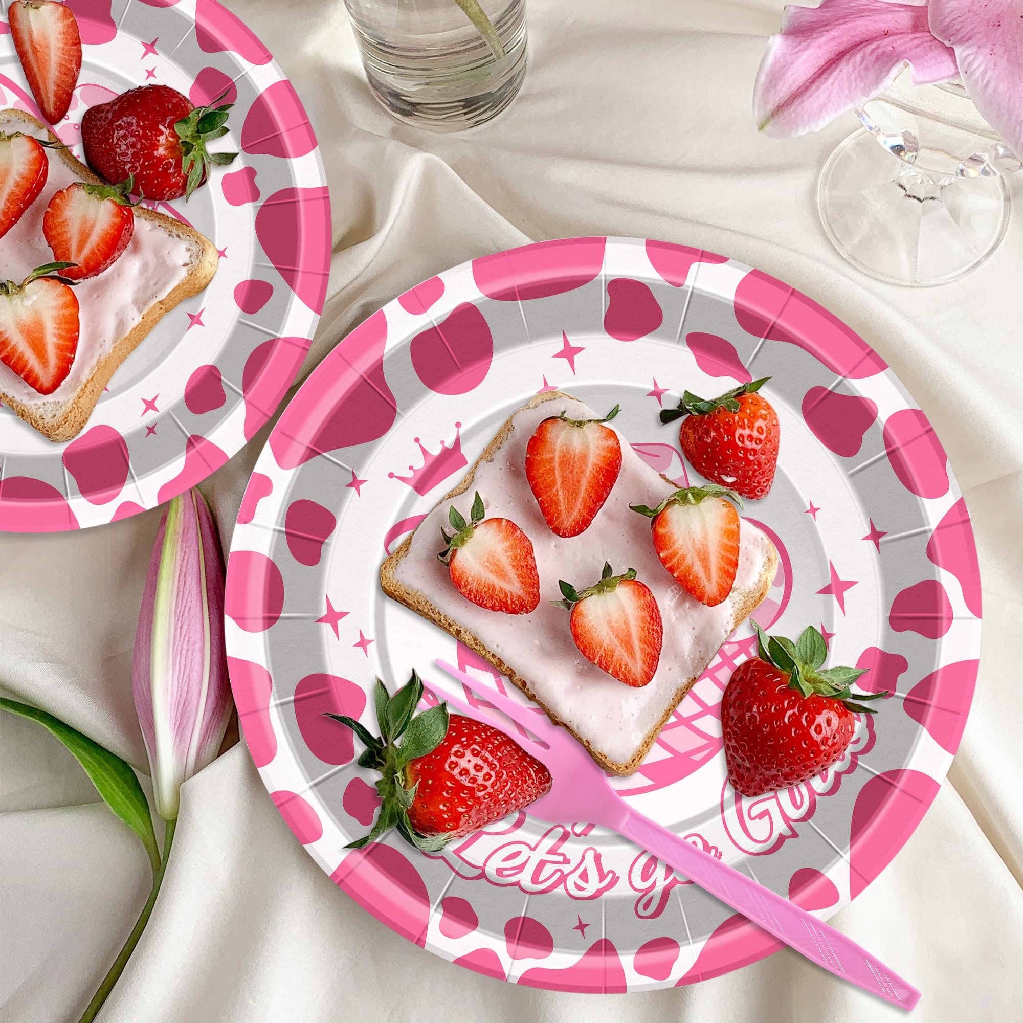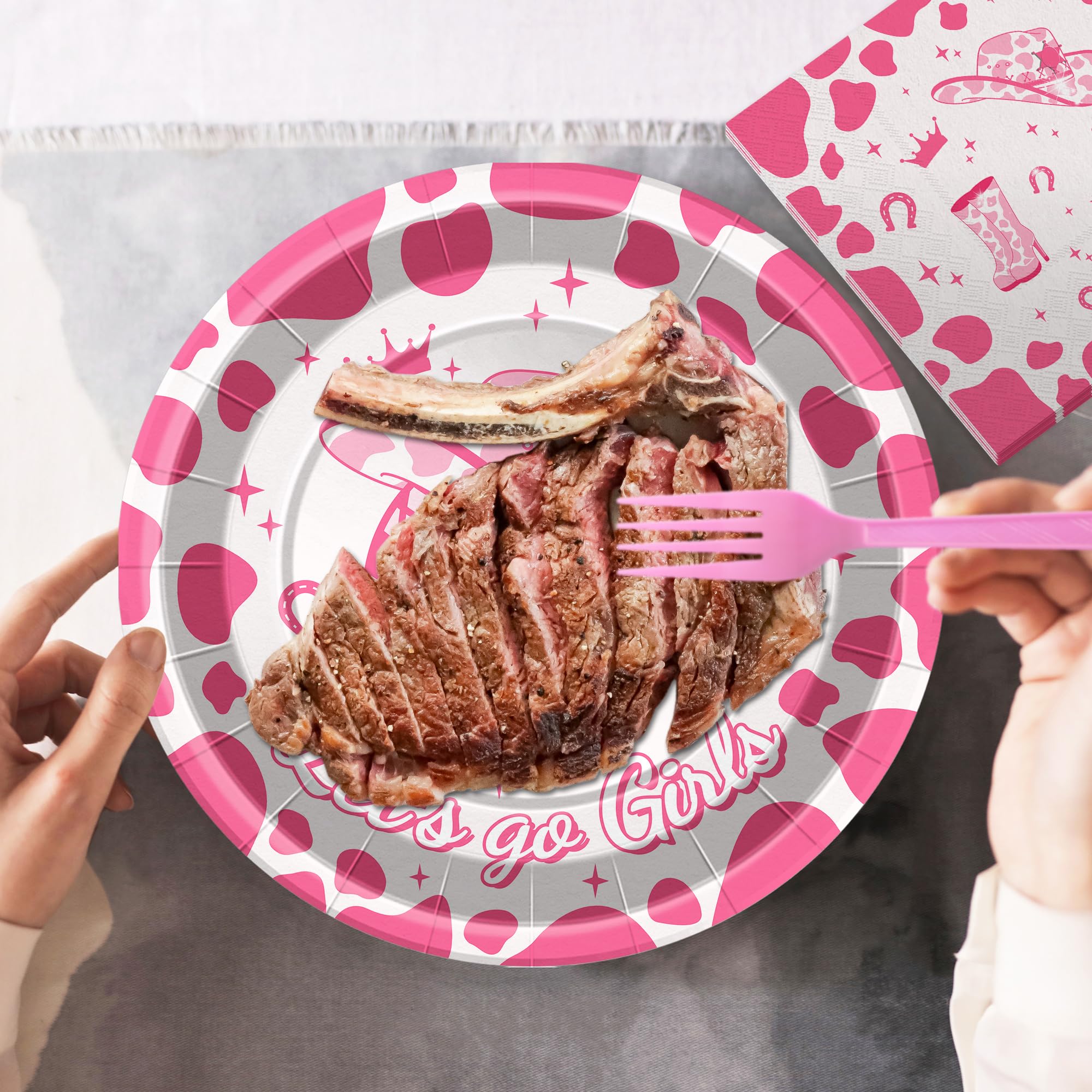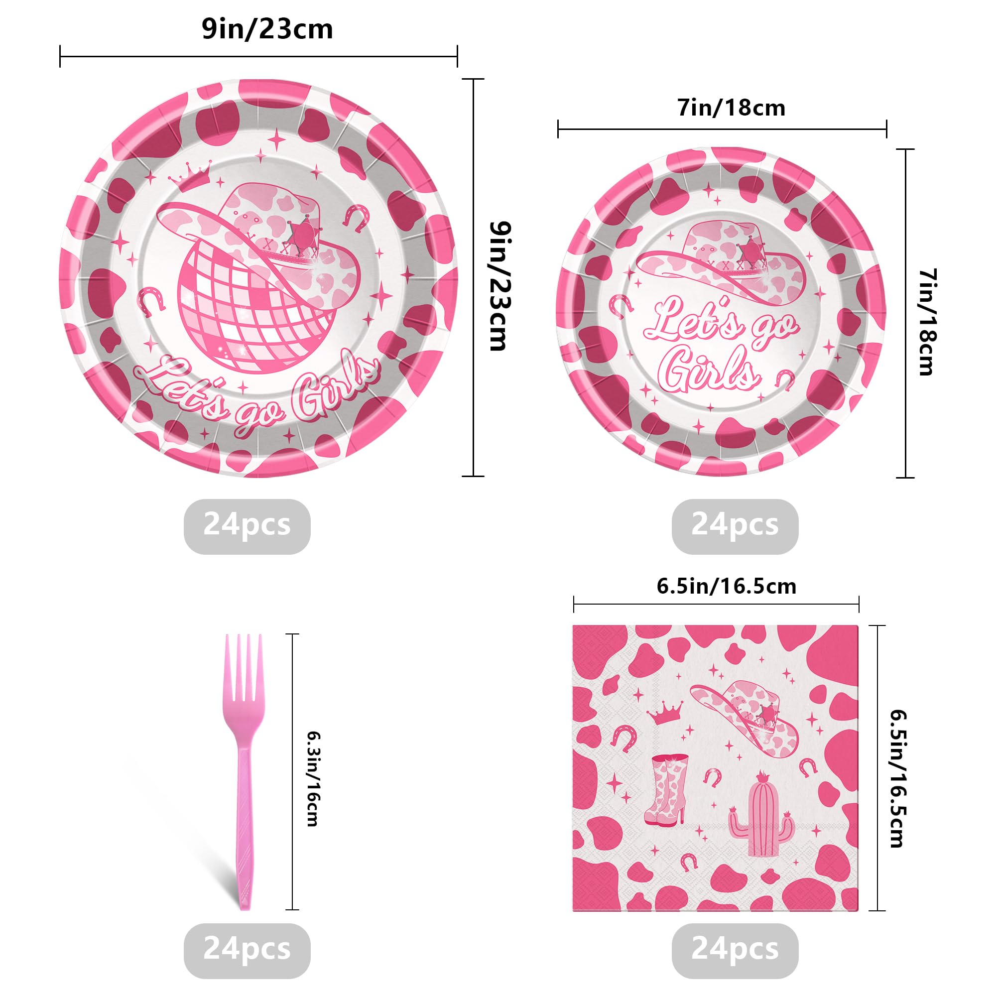 Serves 24 Guests:You will receive Pink cow 24Pcs 7inch dessert plates,24Pcs 9inch dinner plates,24Pcs 6.5 x 6.5 inch napkins and 24Pcs plastic Forks.