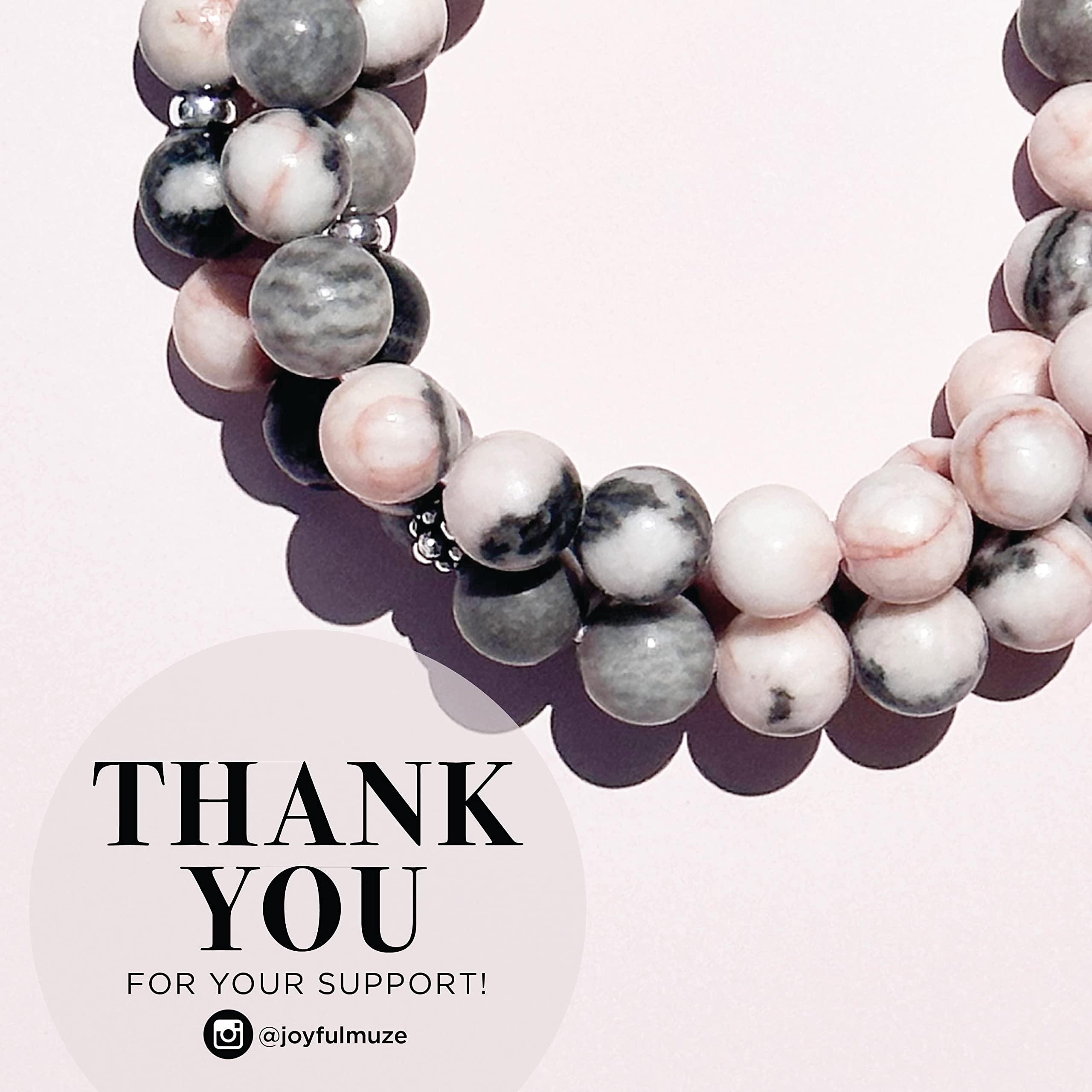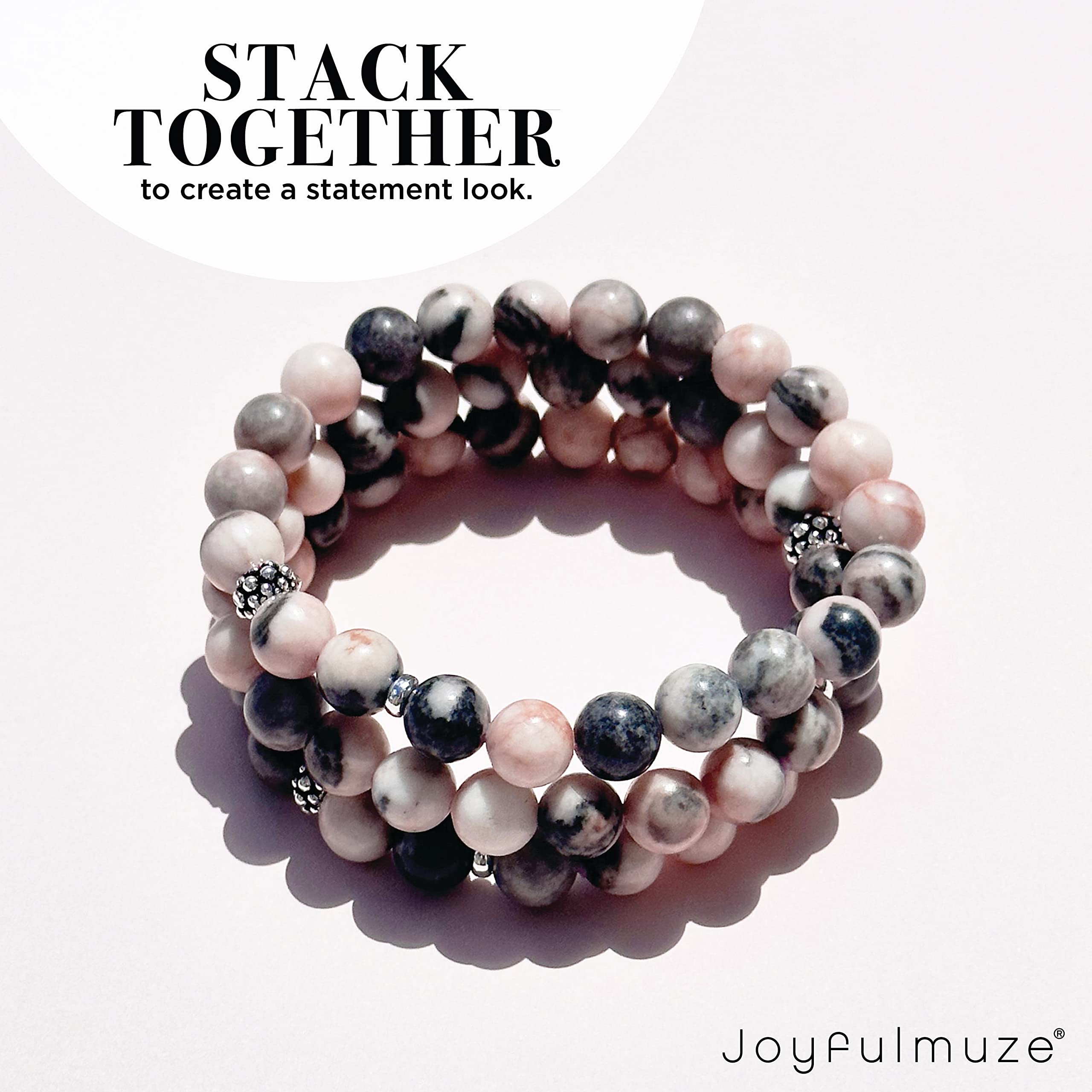 Not only are you supporting a local artist but you are also buying original handmade jewelry. Handmade with love and attention to detail, this natural gemstone stretchy bracelet will flawlessly complement your everyday style. Layer them with my other bracelets or match them with my earring or a necklace. Those semi-precious stones have no dyed, no color enhanced its it natural. Specification: MATERIAL: Natural stones GEMSTONE: Zebra Jasper STONE SIZE: 8mm STRETCH: Pink Elastic WRIST FIT: 6.5-7 inch wrist One bracelet per box HANDCRAFTED WITH LOVE