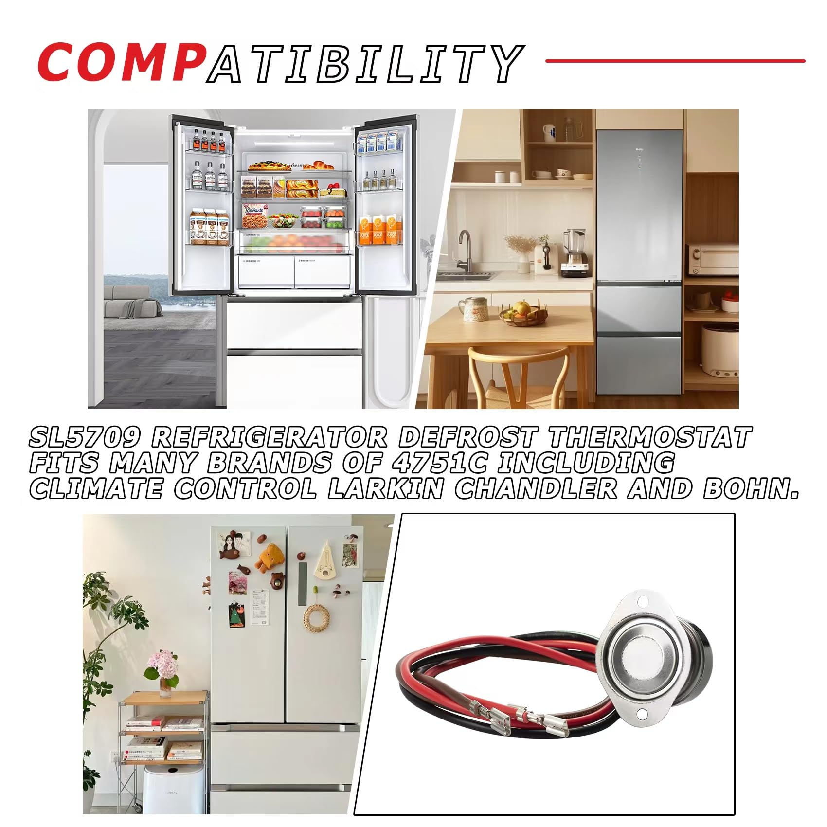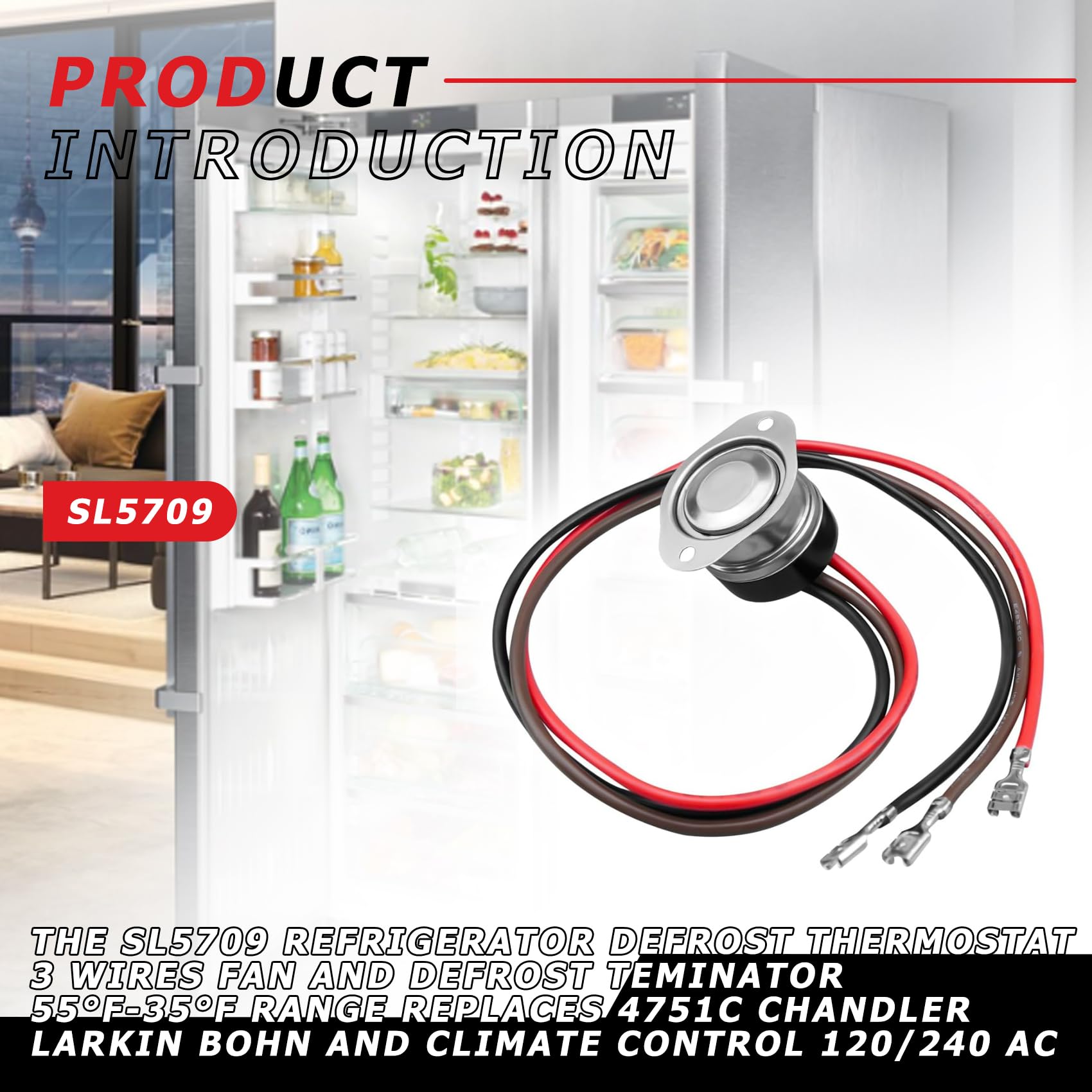 Compatible:5709L Refrigerator Defrost Thermostat fits many brands of 4751C including Climate Control, Larkin, Chandler, and Bohn.Replace SL5709 3 Wires fan and Defrost Teminator,Fits NOR095388 Defrost End Fan Delay for Model 4751C,Fits for Norlake 27813 Defrost Termination Switch