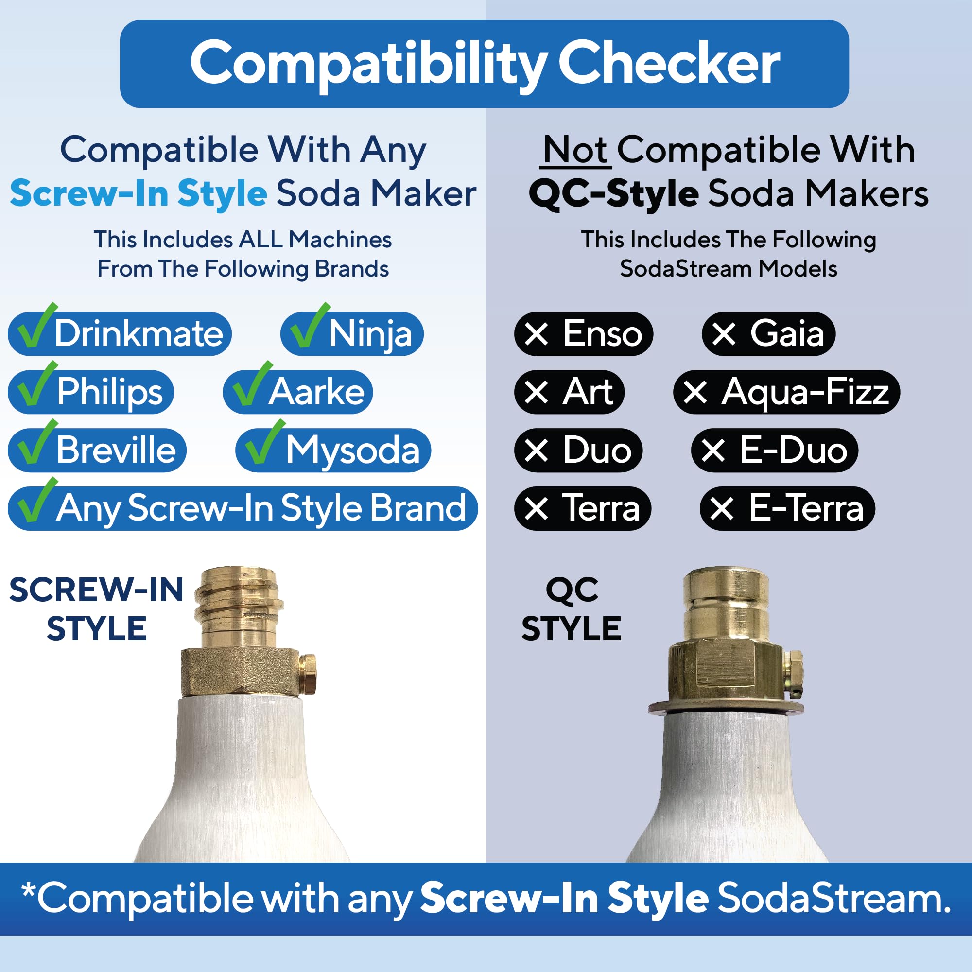 GUARANTEED COMPATIBILITY: Compatible with all soda makers that use threaded/screw-in 60L cylinders (SodaStream, Soda Sensei, Ninja Thirsti, etc.).
