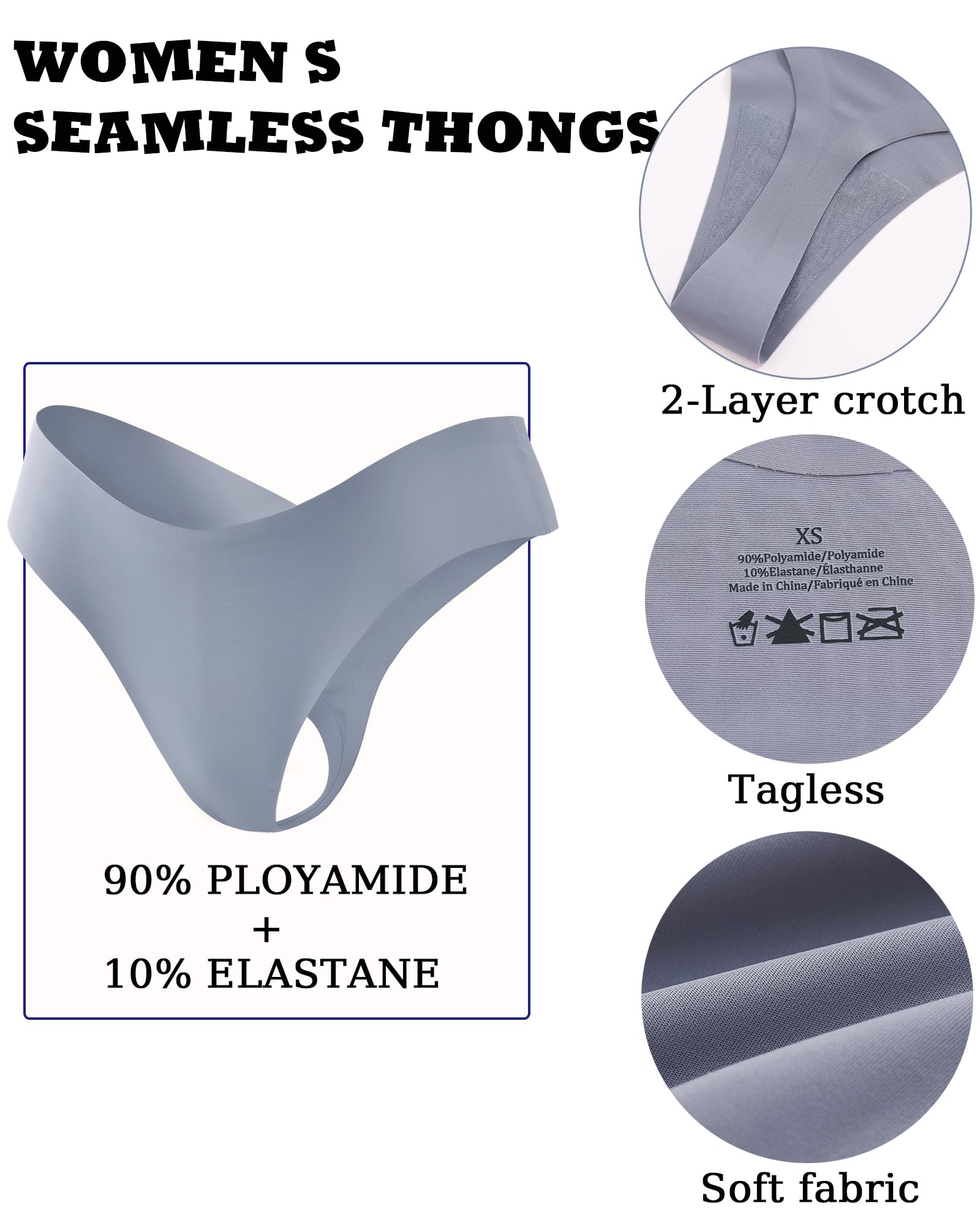 Comfortable Stretch Panties: Made of 90% Ployamide and 10% Elastane,our flattering thong underwear women will offer you an extreme comfort with tagless design, no itch and no scratch.