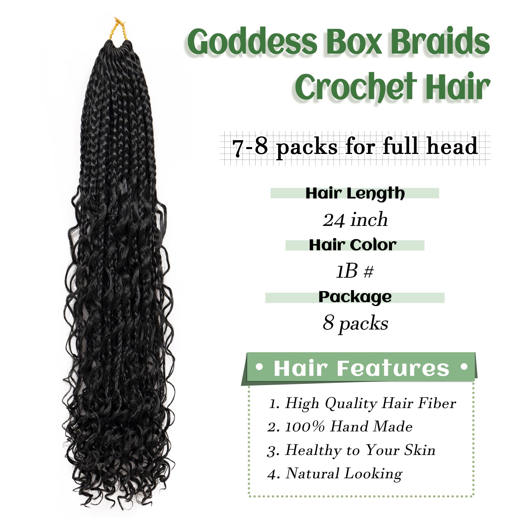 Hair Length and Package: goddess box braids crochet hair is 10 inch, 12 inch and 14 inch,18 inch and 24 inch, 8-9 packs are enough to make a full head. Hair Color:1B, #2 , #27 , #30 , 1B /27 color, 1B/30, T30/27,T30/613,Tgray color and 1B/Burgundy color. More colors are available.