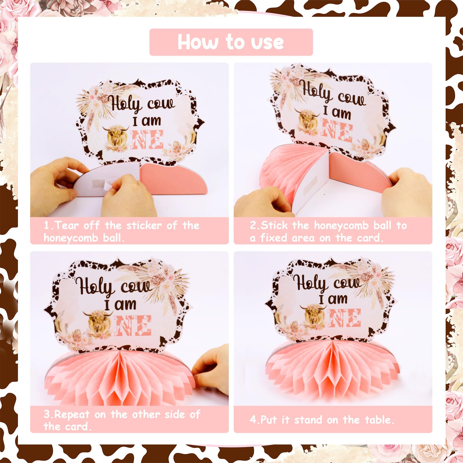 Package Includes: 8 x highland cow honeycomb centerpieces How to use: 1.Tear off the sticker of the honeycomb ball. 2.Stick the honeycomb ball to a fixed area on the card . 3.Repeat on the other side of the card. 4.Put it stand on the table.